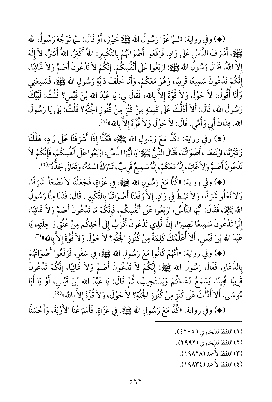 - وفي رواية: «كنا مع رسول الله صَلى الله عَليه وسَلم في غزاة، فجعلنا لا نصعد شرفا، ولا نعلو شرفا، ولا نهبط في واد، إلا رفعنا أصواتنا بالتكبير، قال: فدنا منا رسول الله صَلى الله عَليه وسَلم فقال: أيها الناس، اربعوا على أنفسكم، فإنكم ما تدعون أصم ولا غائبا، إنما تدعون سميعا بصيرا، إن الذي تدعون أقرب إلى أحدكم من عنق راحلته، يا عبد الله بن قيس، ألا أعلمك كلمة من كنوز الجنة؟ لا حول ولا قوة إلا بالله» (¬١).