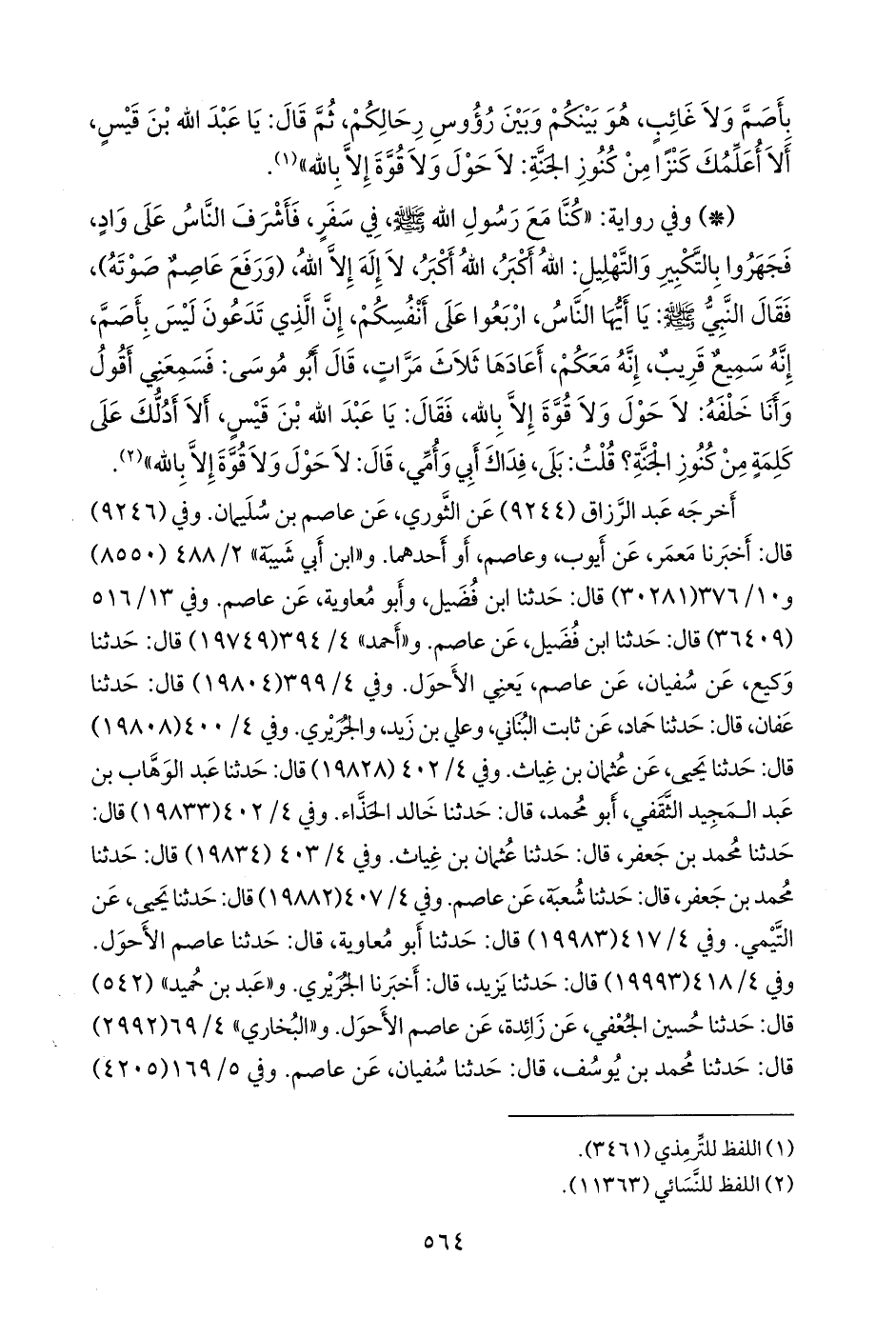 - وفي رواية: «كنا مع رسول الله صَلى الله عَليه وسَلم في سفر، فأشرف الناس على واد، فجهروا بالتكبير والتهليل: الله أكبر، الله أكبر، لا إله إلا الله، (ورفع عاصم صوته)، فقال النبي صَلى الله عَليه وسَلم: يا أيها الناس، اربعوا على أنفسكم، إن الذي تدعون ليس بأصم، إنه سميع قريب، إنه معكم، أعادها ثلاث مرات، قال أَبو موسى: فسمعني أقول وأنا خلفه: لا حول ولا قوة إلا بالله، فقال: يا عبد الله بن قيس، ألا أدلك على كلمة من كنوز الجنة؟ قلت: بلى، فداك أبي وأمي، قال: لا حول ولا قوة إلا بالله» (¬١).