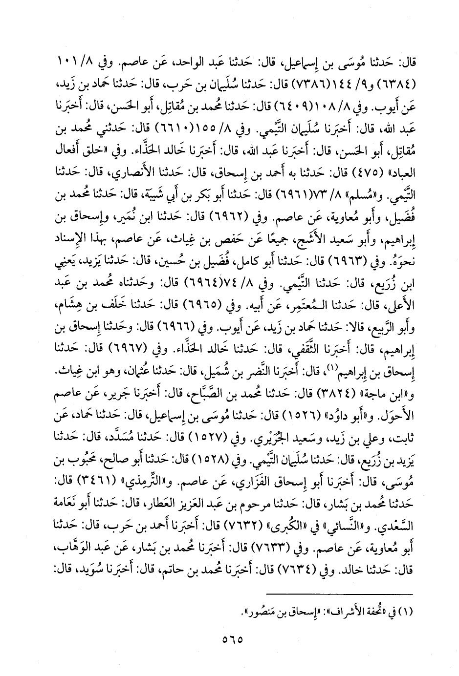 أخبرنا عبد الله، عن خالد الحَذَّاء. وفي (٨٧٧٢ و ١٠٢٩٦ و ١١٣٦٣) قال: أخبرنا عبدة بن عبد الله، عن سويد، هو ابن عَمرو الكلبي، عن زهير، وهو ابن معاوية، قال: حدثنا عاصم الأحول، ثقةٌ مأمونٌ. وفي (٨٧٧٣) قال: أخبرنا عَمرو بن علي، وبشر بن هلال، قالا: حدثنا يحيى، عن سليمان. وفي (١٠١١٦) قال: أخبرنا هلال بن بشر، قال: حدثنا مرحوم، قال: حدثنا أَبو نَعامة السعدي. وفي (١٠٢٩٤) قال: أخبرنا حميد بن مَسعَدة، قال: حدثنا يزيد، وهو ابن زُريع، قال: حدثنا سليمان التيمي. وفي (١٠٢٩٥) وعن محمد بن عبد الأعلى، عن مُعتَمِر بن سليمان، عن أبيه. وفي (١٠٣١٠) قال: أخبرنا محمد بن بشار، قال: حدثنا مرحوم بن عبد العزيز، هو العطار، قال: حدثنا أَبو نَعامة السعدي. و «أَبو يَعلى» (٧٢٥٢) قال: حدثنا خلف بن هشام البزار، قال: حدثنا حماد بن زيد، عن أيوب. و «ابن خزيمة» (٢٥٦٣) قال: حدثنا محمد بن بشار، قال: حدثنا مرحوم بن عبد العزيز، قال: حدثنا أَبو نَعامة السعدي. و «ابن حِبَّان» (٨٠٤) قال: أخبرنا أحمد بن محمد الحيري، قال: حدثنا عبد الله بن هاشم، قال: حدثنا يحيى القطان، عن سليمان التيمي.