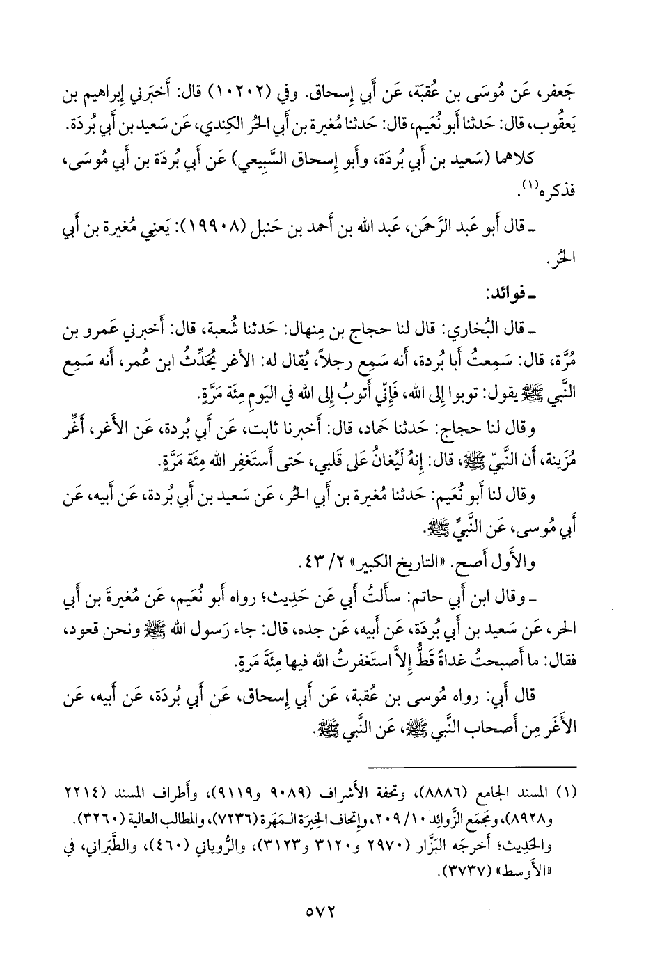 - وقال ابن أبي حاتم: سألتُ أبي عن حديثٍ؛ رواه أَبو نُعيم، عن مغيرة بن أبي الحر، عن سعيد بن أبي بردة، عن أبيه، عن جَدِّه، قال: جاء رسول الله صَلى الله عَليه وسَلم ونحن قعود، فقال: ما أصبحت غداة قط إلا استغفرت الله فيها مئة مرة.