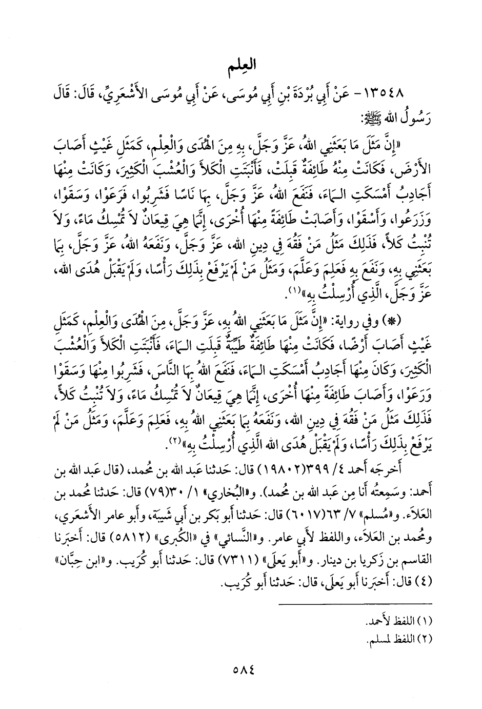 «إن مثل ما بعثني الله، عز وجل، به من الهدى والعلم، كمثل غيث أصاب الأرض، فكانت منه طائفة قبلت، فأنبتت الكلأ والعشب الكثير، وكانت منها أجادب أمسكت الماء، فنفع الله، عز وجل، بها ناسا فشربوا، فرعوا، وسقوا، وزرعوا، وأسقوا، وأصابت طائفة منها أخرى، إنما هي قيعان لا تمسك ماء، ولا تنبت كلأ، فذلك مثل من فقه في دين الله، عز وجل، ونفعه الله، عز وجل، بما بعثني به، ونفع به فعلم وعلم، ومثل من لم يرفع بذلك رأسا، ولم يقبل هدى الله، عز وجل، الذي أرسلت به» (¬١).
