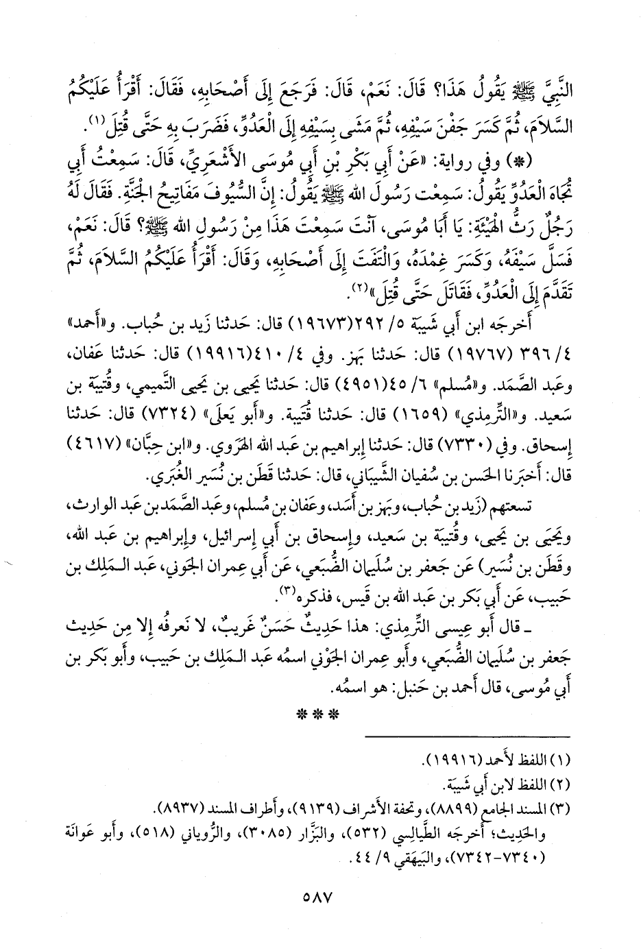 تسعتهم (زيد بن حباب، وبَهز بن أسد، وعفان بن مسلم، وعبد الصمد بن عبد الوارث، ويحيى بن يحيى، وقتيبة بن سعيد، وإسحاق بن أبي إسرائيل، وإبراهيم بن عبد الله، وقطن بن نُسير) عن جعفر بن سليمان الضبعي، عن أبي عمران الجَوني عبد الملك بن حبيب، عن أَبي بكر بن عبد الله بن قيس، فذكره (¬١).