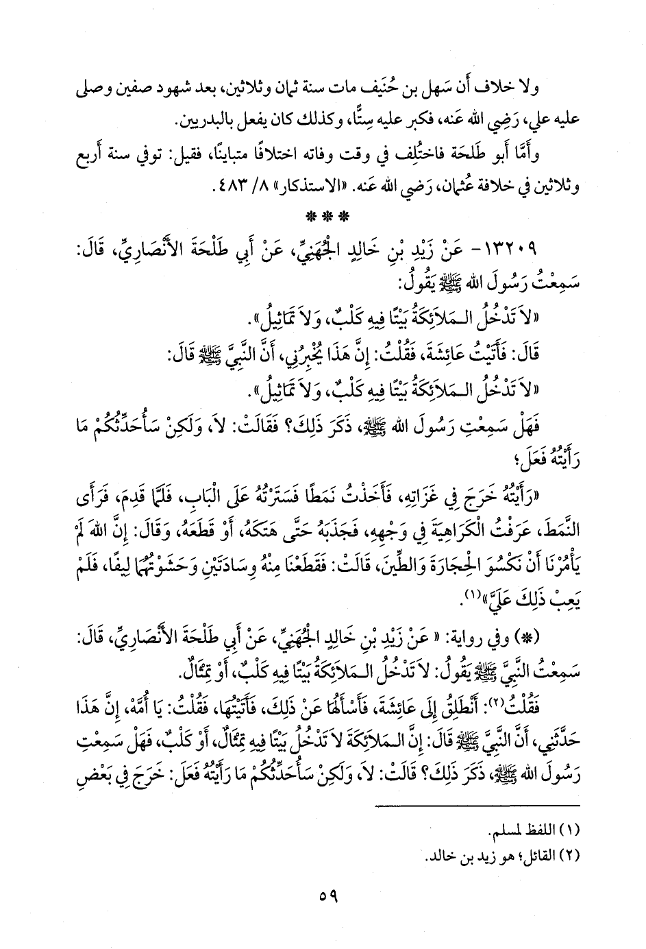 ١٣٢٠٩ - عن زيد بن خالد الجهني، عن أبي طلحة الأَنصاري، قال: سمعت رسول الله صَلى الله عَليه وسَلم يقول:
