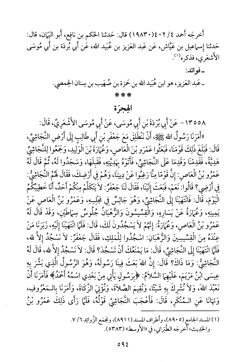 «أمرنا رسول الله صَلى الله عَليه وسَلم أن ننطلق مع جعفر بن أبي طالب إلى أرض النجاشي، قال: فبلغ ذلك قومنا, فبعثوا عَمرو بن العاص، وعمارة بن الوليد, وجمعوا للنجاشي هدية، فقدمنا وقدما على النجاشي, فأتوه بهديته، فقبلها, وسجدوا له، ثم قال له عَمرو بن العاص: إن قوما منا رغبوا عن ديننا، وهم في أرضك، فقال لهم النجاشي: في أرضي؟ قالوا: نعم, فبعث إلينا، فقال لنا جعفر: لا يتكلم منكم أحد, أنا خطيبكم اليوم، قال: فانتهينا إلى النجاشي، وهو جالس في مجلسه، وعَمرو بن العاص عن يمينه، وعمارة عن يساره, والقسيسون والرهبان جلوس سماطين, وقد قال له عَمرو بن العاص، وعمارة: إنهم لا يسجدون لك، قال: فلما انتهينا إليه، زبرنا من عنده من القسيسين والرهبان: اسجدوا للملك، فقال جعفر: لا نسجد إلا لله، فلما انتهينا إلى النجاشي، قال: ما يمنعك أن تسجد؟ قال: لا نسجد إلا لله، قال له النجاشي: وما ذاك؟ قال: إن الله بعث فينا رسوله، وهو الرسول الذي بشر به عيسى ابن مريم، عليهما السلام: {برسول يأتي من بعدي اسمه أحمد} فأمرنا أن نعبد الله، ولا نشرك به شيئا, ونقيم الصلاة، ونؤتي الزكاة, وأمرنا بالمعروف، ونهانا عن المنكر، قال: فأعجب النجاشي قوله، فلما رأى ذلك عَمرو بن