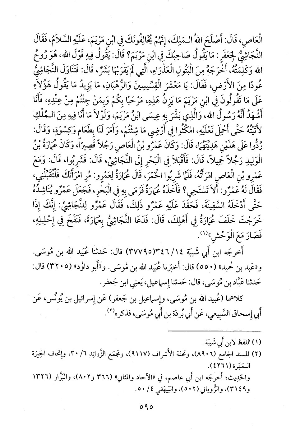 فقال: يا معشر القسيسين والرهبان, ما يزيد ما يقول هؤلاء على ما تقولون في ابن مريم ما يزن هذه, مرحبا بكم وبمن جئتم من عنده, فأنا أشهد أنه رسول الله، والذي بشر به عيسى ابن مريم, ولولا ما أنا فيه من الملك لأتيته حتى أحمل نعليه, امكثوا في أرضي ما شئتم, وأمر لنا بطعام وكسوة، وقال: ردوا على هذين هديتهما، قال: وكان عَمرو بن العاص رجلا قصيرا, وكان عمارة بن الوليد رجلا جميلا، قال: فأقبلا في البحر إلى النجاشي، قال: فشربوا، قال: ومع عَمرو بن العاص امرأته، فلما شربوا الخمر، قال عمارة لعَمرو: مر امرأتك فلتقبلني، فقال له عَمرو: ألا تستحي؟ فأخذه عمارة فرمى به في البحر، فجعل عَمرو يناشده حتى أدخله السفينة, فحقد عليه عَمرو ذلك، فقال عَمرو للنجاشي: إنك إذا خرجت خلف عمارة في أهلك، قال: فدعا النجاشي بعمارة، فنفخ في إحليله، فصار مع الوحش» (¬١).