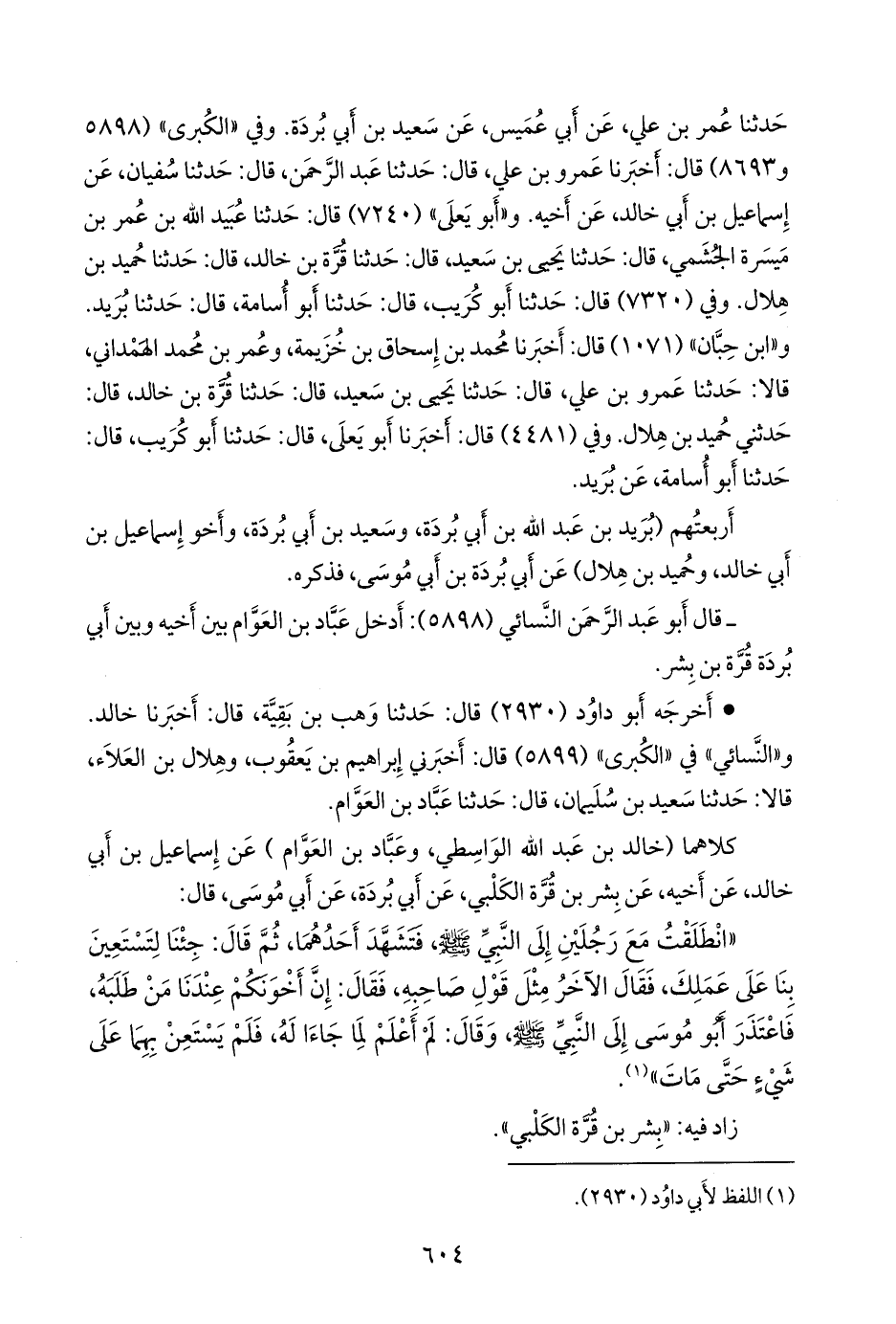 وفي «الكبرى» (٥٨٩٨ و ٨٦٩٣) قال: أخبرنا عَمرو بن علي، قال: حدثنا عبد الرَّحمَن، قال: حدثنا سفيان، عن إسماعيل بن أبي خالد، عن أخيه. و «أَبو يَعلى» (٧٢٤٠) قال: حدثنا عُبيد الله بن عمر بن ميسرة الجشمي، قال: حدثنا يحيى بن سعيد، قال: حدثنا قرة بن خالد، قال: حدثنا حميد بن هلال. وفي (٧٣٢٠) قال: حدثنا أَبو كُريب، قال: حدثنا أَبو أُسامة، قال: حدثنا بريد. و «ابن حِبَّان» (١٠٧١) قال: أخبرنا محمد بن إسحاق بن خزيمة، وعمر بن محمد الهمداني، قالا: حدثنا عَمرو بن علي، قال: حدثنا يحيى بن سعيد، قال: حدثنا قرة بن خالد، قال: حدثني حميد بن هلال. وفي (٤٤٨١) قال: أخبرنا أَبو يَعلى، قال: حدثنا أَبو كُريب، قال: حدثنا أَبو أُسامة، عن بريد.