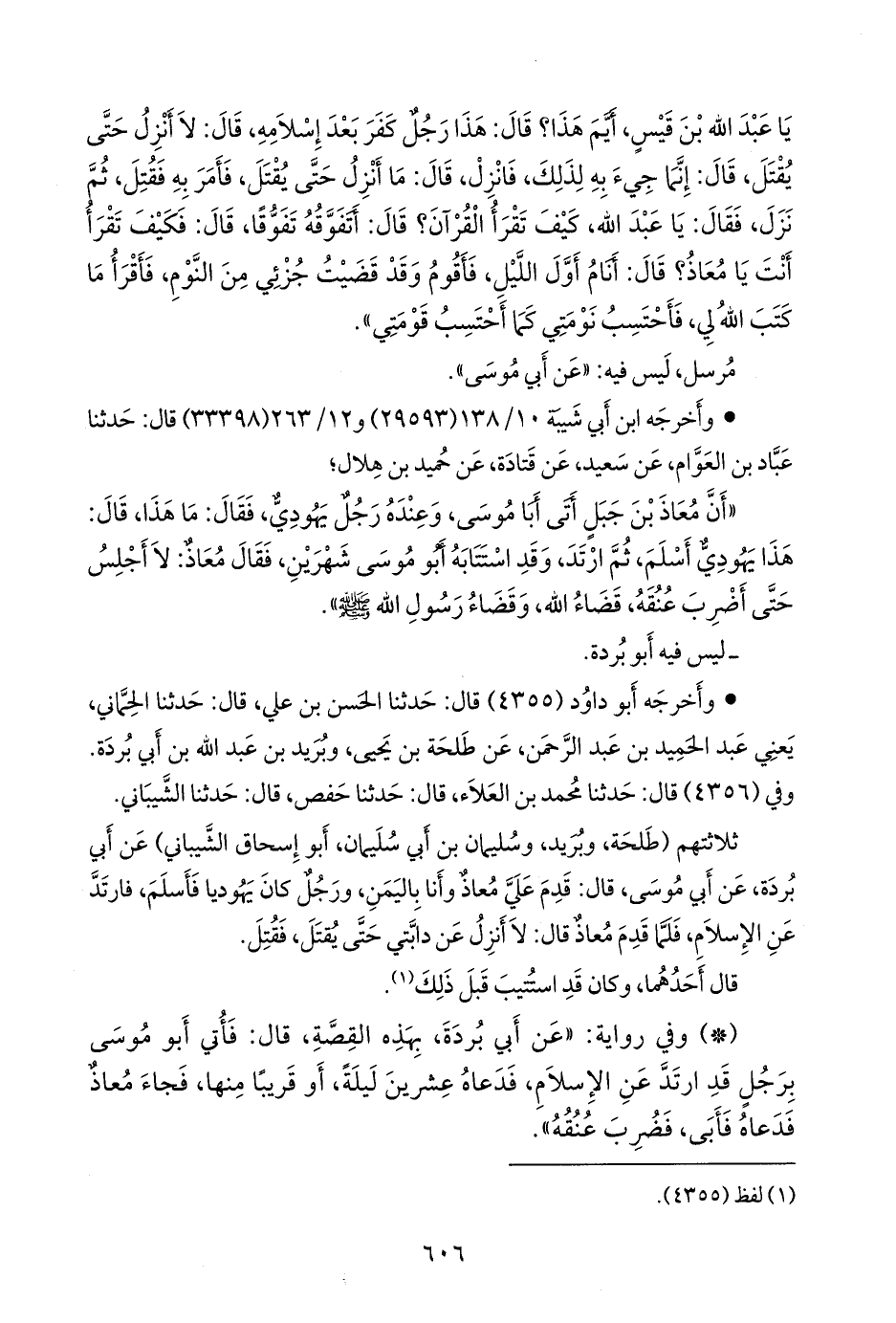 ثلاثتهم (طلحة، وبريد، وسليمان بن أبي سليمان، أَبو إسحاق الشيباني) عن أبي بردة، عن أبي موسى، قال: قدم علي معاذ وأنا باليمن، ورجل كان يهوديا فأسلم، فارتد عن الإسلام، فلما قدم معاذ قال: لا أنزل عن دابتي حتى يقتل، فقتل.