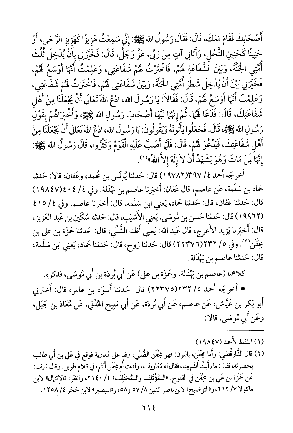 أخرجه أحمد (١٩٧٨٢) قال: حدثنا يونس بن محمد، وعفان، قالا: حدثنا حماد بن سلمة، عن عاصم، قال عفان: أخبرنا عاصم بن بهدلة. وفي ٤/ ٤٠٤ (١٩٨٤٧) قال: حدثنا عفان، قال: حدثنا حماد، يعني ابن سلمة، قال: أخبرنا عاصم. وفي ٤/ ٤١٥ (١٩٩٦٢) قال: حدثنا حسن بن موسى، يعني الأشيب، قال: حدثنا سكين بن عبد العزيز، قال: أخبرنا يزيد الأعرج، قال عبد الله: يعني أظنه الشني، قال: حدثنا حمزة بن علي بن محفن (¬٢). وفي ٥/ ٢٣٢ (٢٢٣٧٦) قال: حدثنا روح، قال: حدثنا حماد، يعني ابن سلمة، قال: حدثنا عاصم بن بهدلة.
