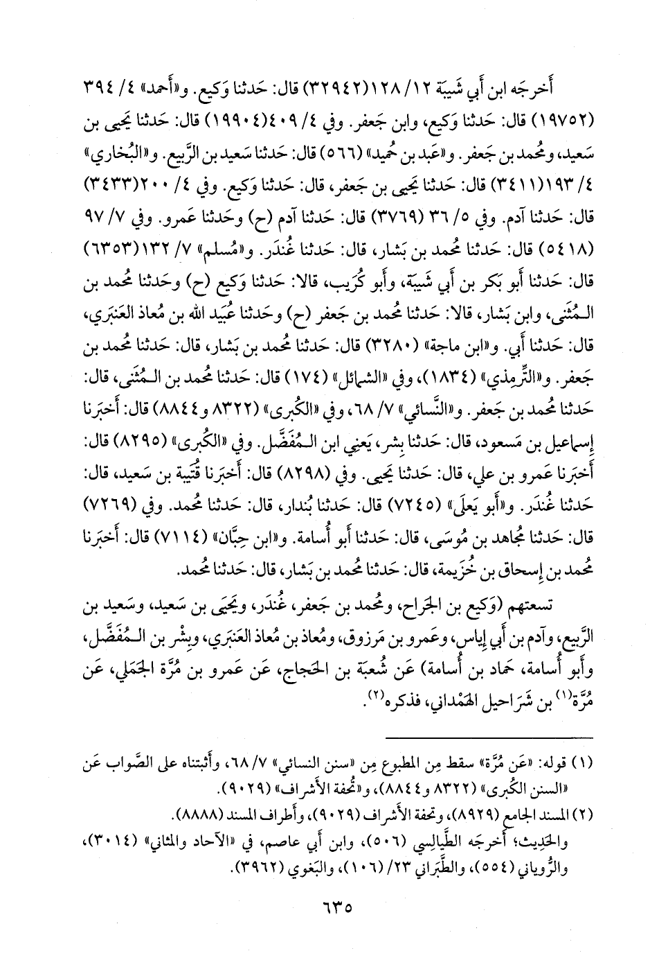 تسعتهم (وكيع بن الجراح، ومحمد بن جعفر غُندَر، ويحيى بن سعيد، وسعيد بن الربيع، وآدم بن أبي إياس، وعَمرو بن مرزوق، ومعاذ بن معاذ العنبري، وبشر بن المُفَضَّل، وأَبو أُسامة حماد بن أُسامة) عن شعبة بن الحجاج، عن عَمرو بن مُرَّة الجملي، عن مرة (¬١) بن شراحيل الهمداني، فذكره (¬٢).
