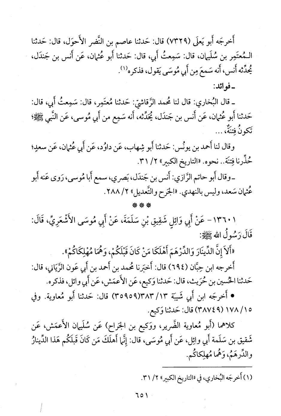 - قال البخاري: قال لنا محمد الرَّقَاشي: حدثنا معتمر، قال: سمعت أبي، قال: حدثنا أَبو عثمان، عن أَنس بن جندل، يحدثه، أنه سمع من أبي موسى، عن النبي صَلى الله عَليه وسَلم؛ تكون فتنة، ...