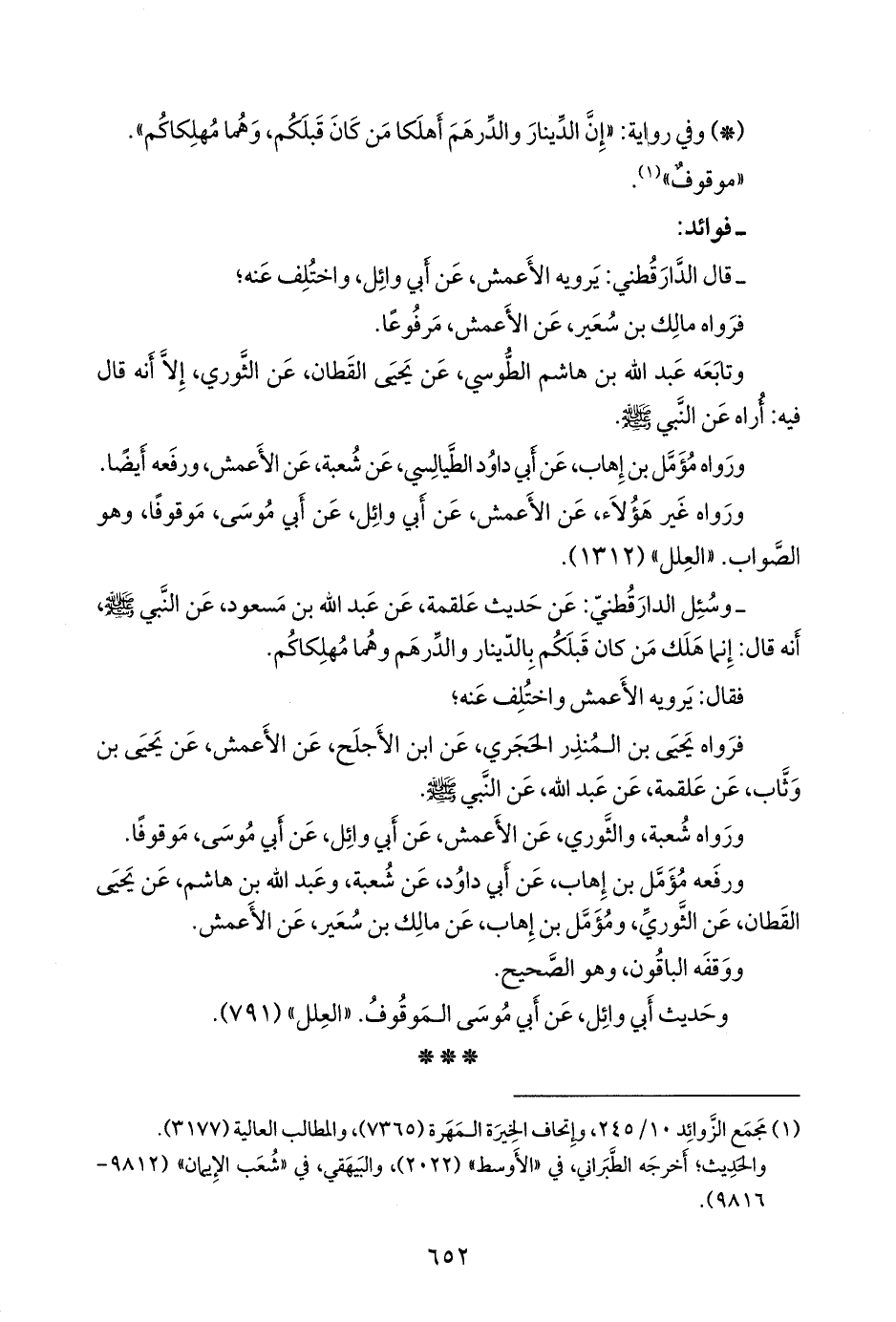 - وسئل الدارقُطني: عن حديث علقمة، عن عبد الله بن مسعود، عن النبي صَلى الله عَليه وسَلم أنه قال: إنما هلك من كان قبلكم بالدينار والدرهم وهما مهلكاكم.