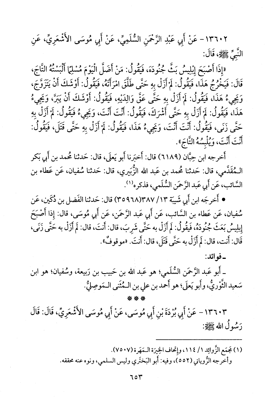 • أخرجه ابن أبي شيبة (٣٥٩٦٨) قال: حدثنا الفضل بن دُكَين، عن سفيان، عن عطاء بن السائب، عن أبي عبد الرَّحمَن، عن أبي موسى، قال: إذا أصبح إبليس بعث جنوده، فيقول: لم أزل به حتى شرب، قال: أنت، قال: لم أزل به حتى زنى، قال: أنت، قال: لم أزل به حتى قتل، قال: أنت. «موقوف».