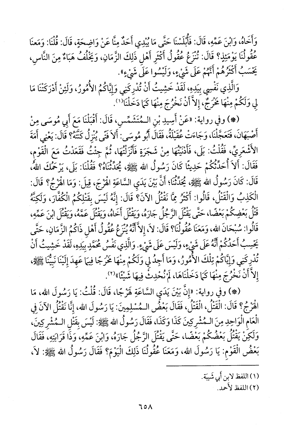 - وفي رواية: «إن بين يدي الساعة لهرجا، قال: قلت: يا رسول الله، ما الهرج؟ قال: القتل، القتل، فقال بعض المسلمين: يا رسول الله، إنا نقتل الآن في العام الواحد من المشركين كذا وكذا، فقال رسول الله صَلى الله عَليه وسَلم: ليس بقتل المشركين، ولكن يقتل بعضكم بعضا، حتى يقتل الرجل جاره، وابن عمه، وذا قرابته، فقال بعض القوم: يا رسول الله، ومعنا عقولنا ذلك اليوم؟ فقال رسول الله صَلى الله عَليه وسَلم: لا،