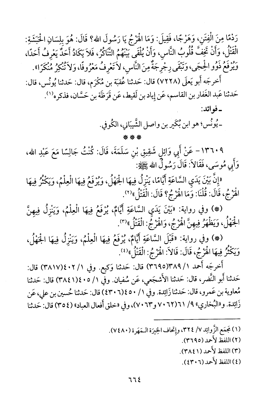 - وفي رواية: «قبل الساعة أيام، يرفع فيها العلم، وينزل فيها الجهل، ويكثر فيها الهرج، قال: قالا: الهرج: القتل» (¬٣).