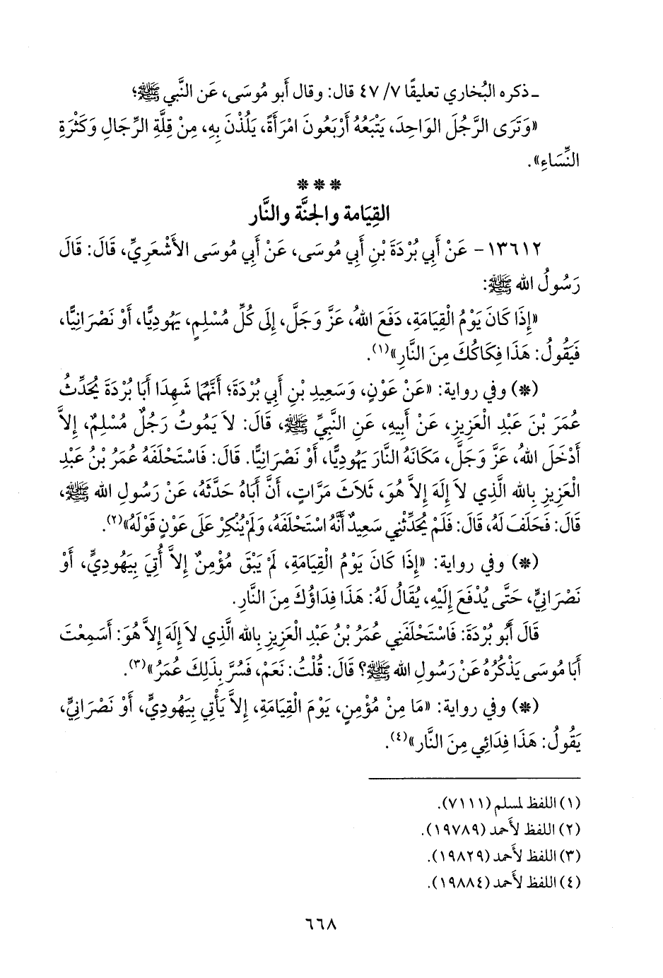 - وفي رواية: «ما من مؤمن، يوم القيامة، إلا يأتي بيهودي، أو نصراني، يقول: هذا فدائي من النار» (¬١).
