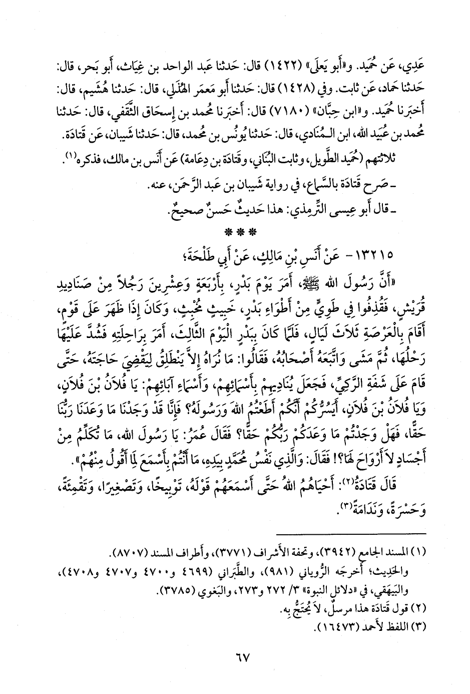 «أن رسول الله صَلى الله عَليه وسَلم أمر يوم بدر، بأربعة وعشرين رجلا من صناديد قريش، فقذفوا في طوي من أطواء بدر، خبيث مخبث، وكان إذا ظهر على قوم، أقام بالعرصة ثلاث ليال، فلما كان ببدر اليوم الثالث، أمر براحلته فشد عليها رحلها، ثم مشى واتبعه أصحابه، فقالوا: ما نراه إلا ينطلق ليقضي حاجته، حتى قام على شفة الركي، فجعل يناديهم بأسمائهم، وأسماء آبائهم: يا فلان بن فلان، ويا فلان بن فلان، أيسركم أنكم أطعتم الله ورسوله؟ فإنا قد وجدنا ما وعدنا ربنا حقا، فهل وجدتم ما وعدكم ربكم حقا؟ فقال عمر: يا رسول الله، ما تكلم من أجساد لا أرواح لها؟! فقال: والذي نفس محمد بيده، ما أنتم بأسمع لما أقول منهم».