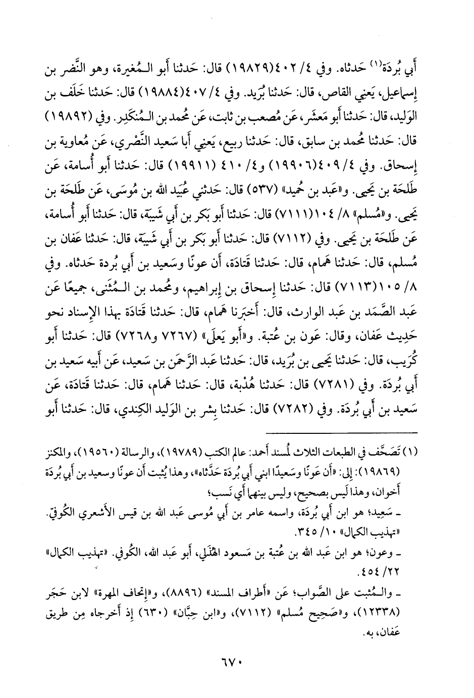 وفي (٧١١٢) قال: حدثنا أَبو بكر بن أبي شيبة، قال: حدثنا عفان بن مسلم، قال: حدثنا همام، قال: حدثنا قتادة، أن عونا وسعيد بن أبي بردة حدثاه. وفي ٨/ ١٠٥ (٧١١٣) قال: حدثنا إسحاق بن إبراهيم، ومحمد بن المثنى، جميعا عن عبد الصمد بن عبد الوارث، قال: أخبرنا همام، قال: حدثنا قتادة بهذا الإسناد نحو حديث عفان، وقال: عون بن عُتبة. و «أَبو يَعلى» (٧٢٦٧ و ٧٢٦٨) قال: حدثنا أَبو كُريب، قال: حدثنا يحيى بن بريد، قال: حدثنا عبد الرَّحمَن بن سعيد، عن أبيه سعيد بن أبي بردة. وفي (٧٢٨١) قال: حدثنا هُدبة، قال: حدثنا همام، قال: حدثنا قتادة، عن سعيد بن أبي بردة. وفي (٧٢٨٢) قال: حدثنا بشر بن الوليد الكندي، قال: حدثنا أَبو