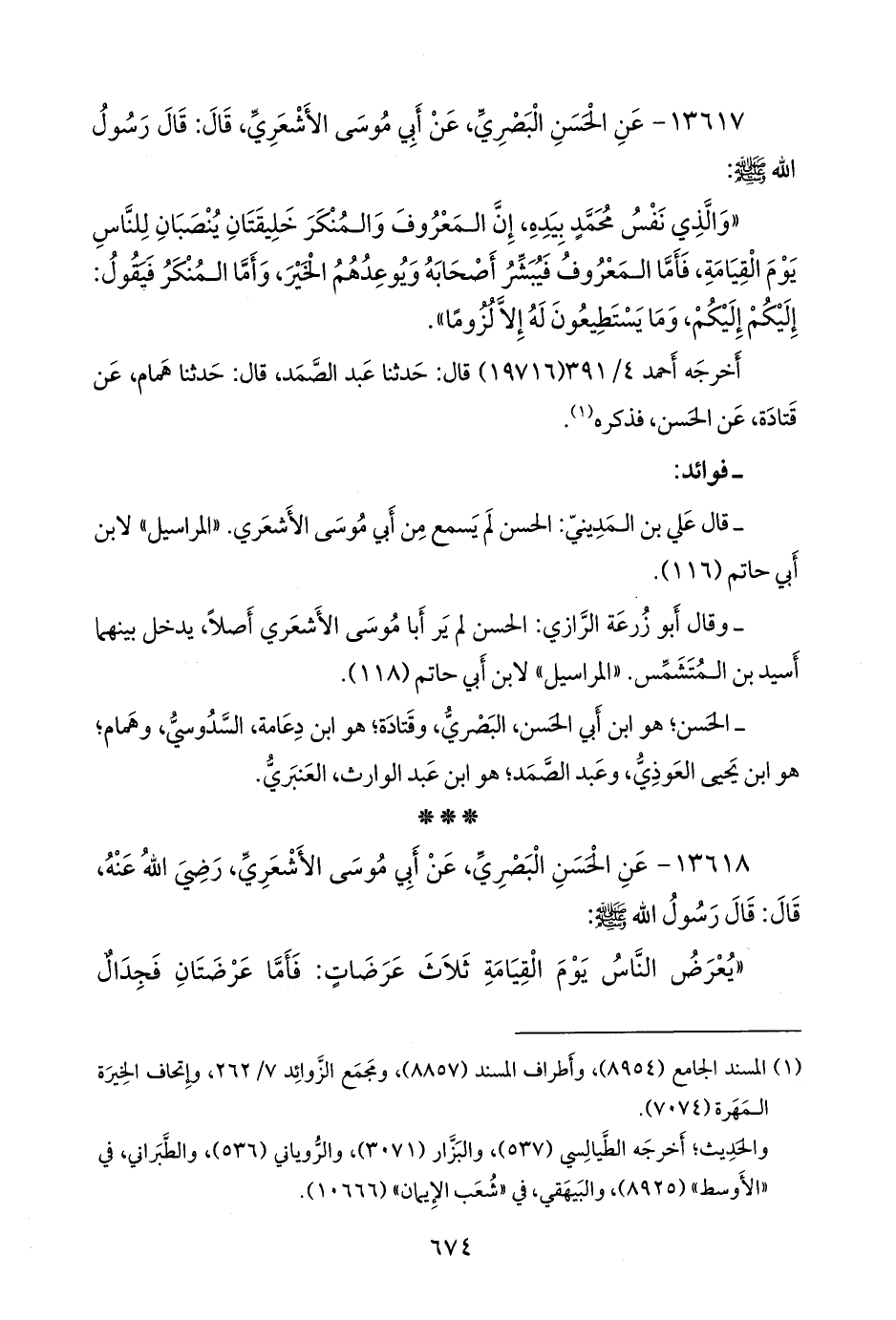 ١٣٦١٨ - عن الحسن البصري، عن أبي موسى الأشعري، رضي الله عنه، قال: قال رسول الله صَلى الله عَليه وسَلم: