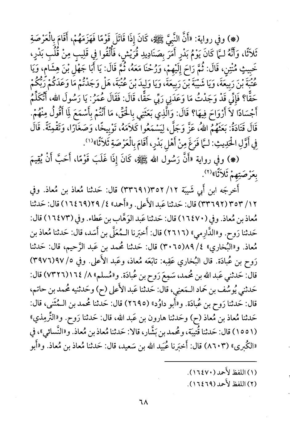- وفي رواية: «أن رسول الله صَلى الله عَليه وسَلم كان إذا غلب قوما، أحب أن يقيم بعرصتهم ثلاثا» (¬١).