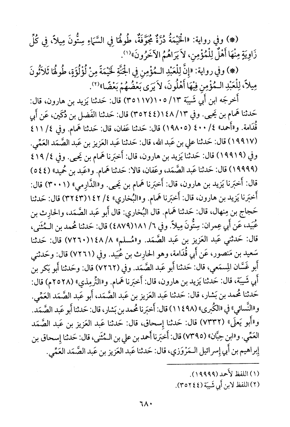 وفي ٤/ ٤١١ (١٩٩١٧) قال: حدثنا علي بن عبد الله، قال: حدثنا عبد العزيز بن عبد الصمد العَمِّي. وفي (١٩٩١٩) قال: حدثنا يزيد بن هارون، قال: أخبرنا همام بن يحيى. وفي ٤/ ٤١٩ (١٩٩٩٩) قال: حدثنا عبد الصمد، وعفان، قالا: حدثنا همام. و «عَبد بن حُميد» (٥٤٤) قال: أخبرنا يزيد بن هارون، قال: أخبرنا همام بن يحيى. و «الدَّارِمي» (٣٠٠١) قال: أخبرنا يزيد بن هارون، قال: أخبرنا همام. و «البخاري» ٤/ ١١٧ (٣٢٤٣) قال: حدثنا حجاج بن مِنهال، قال: حدثنا همام. قال البخاري: قال أَبو عبد الصمد، والحارث بن عبيد، عن أبي عمران: ستون ميلا. وفي ٦/ ١٤٥ (٤٨٧٩) قال: حدثنا محمد بن المثنى، قال: حدثني عبد العزيز بن عبد الصمد. و «مسلم» ٨/ ١٤٨ (٧٢٦٠) قال: حدثنا سعيد بن منصور، عن أبي قدامة، وهو الحارث بن عبيد. وفي (٧٢٦١) قال: وحدثني أَبو غسان المسمعي، قال: حدثنا أَبو عبد الصمد. وفي (٧٢٦٢) قال: وحدثنا أَبو بكر بن أبي شيبة، قال: حدثنا يزيد بن هارون، قال: أخبرنا همام. و «التِّرمِذي» (٢٥٢٨ م) قال: حدثنا محمد بن بشار، قال: حدثنا عبد العزيز بن عبد الصمد العَمِّي. و «النَّسَائي» في «الكبرى» (١١٤٩٨) قال: أخبرنا محمد بن بشار، قال: حدثنا أَبو عبد الصمد. و «أَبو يَعلى» (٧٣٣٢) قال: حدثنا إسحاق، قال: حدثنا عبد العزيز بن عبد الصمد العَمِّي.