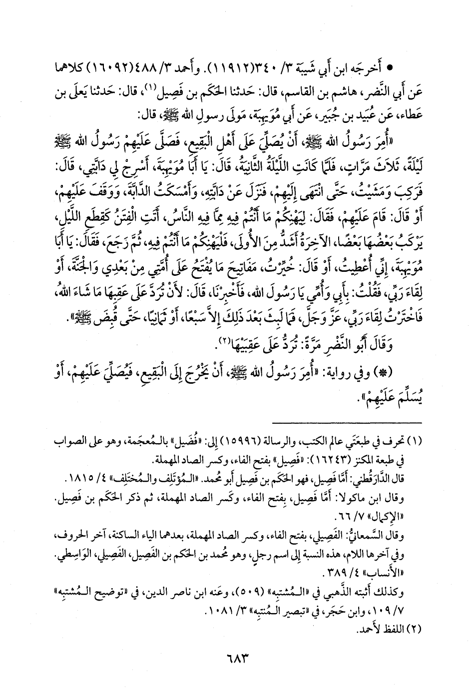 • أخرجه ابن أبي شيبة (١١٩١٢). وأحمد (١٦٠٩٢) كلاهما عن أبي النضر هاشم بن القاسم، قال: حدثنا الحكم بن فصيل (¬١)، قال: حدثنا يَعلى بن عطاء، عن عبيد بن جبير، عن أبي مويهبة مولى رسول الله صَلى الله عَليه وسَلم قال:
