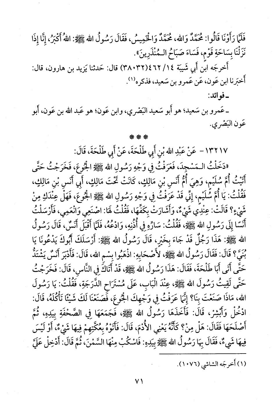 «دخلت المسجد، فعرفت في وجه رسول الله صَلى الله عَليه وسَلم الجوع، فخرجت حتى أتيت أُم سُليم، وهي أم أَنس بن مالك، كانت تحت مالك أبي أَنس بن مالك، فقلت: يا أُم سُليم، إني قد عرفت في وجه رسول الله صَلى الله عَليه وسَلم الجوع، فهل عندك من شيء؟ قالت: عندي شيء، وأشارت بكفها، فقلت لها: اصنعي وانعمي، فأرسلت أنسا إلى رسول الله صَلى الله عَليه وسَلم فقلت: ساره في أذنه، وادعه، فلما أقبل أنس، قال رسول الله صَلى الله عَليه وسَلم: هذا رجل قد جاء بخير، قال رسول الله صَلى الله عَليه وسَلم: أرسلك أَبوك يدعونا يا بني؟ قال: فقال رسول الله صَلى الله عَليه وسَلم لأصحابه: اذهبوا باسم الله، قال: فأدبر أَنس يشتد حتى أتى أبا طلحة، فقال: هذا رسول الله صَلى الله عَليه وسَلم قد أتاك في الناس، قال: فخرجت حتى لقيت رسول الله صَلى الله عَليه وسَلم عند الباب، على مستراح الدرجة، فقلت: يا رسول الله، ماذا صنعت بنا؟ إنما عرفت في وجهك الجوع، فصنعنا لك شيئًا تأكله، قال: ادخل وأبشر، قال: فأخذها رسول الله صَلى الله عَليه وسَلم فجمعها في الصحفة بيده، ثم أصلحها فقال: هل من؟ كأنه يعني الأدم، قال: فأتوه بعكتهم فيها شيء، أو ليس فيها شيء، فقال بها رسول الله صَلى الله عَليه وسَلم بيده، فأسكب منها السمن، ثم قال: أدخل علي