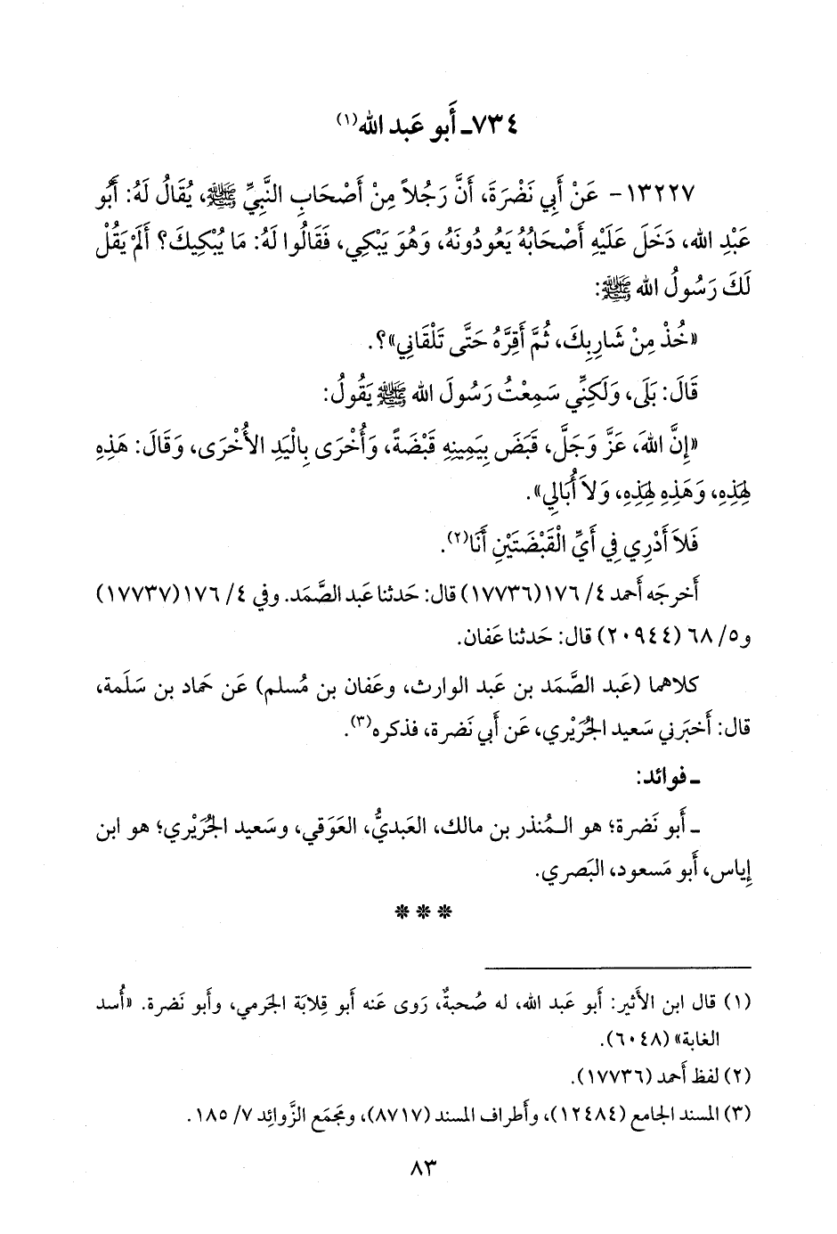 (¬٣) المسند الجامع (١٢٤٨٤)، وأطراف المسند (٨٧١٧)، ومَجمَع الزوائد ٧/ ١٨٥.