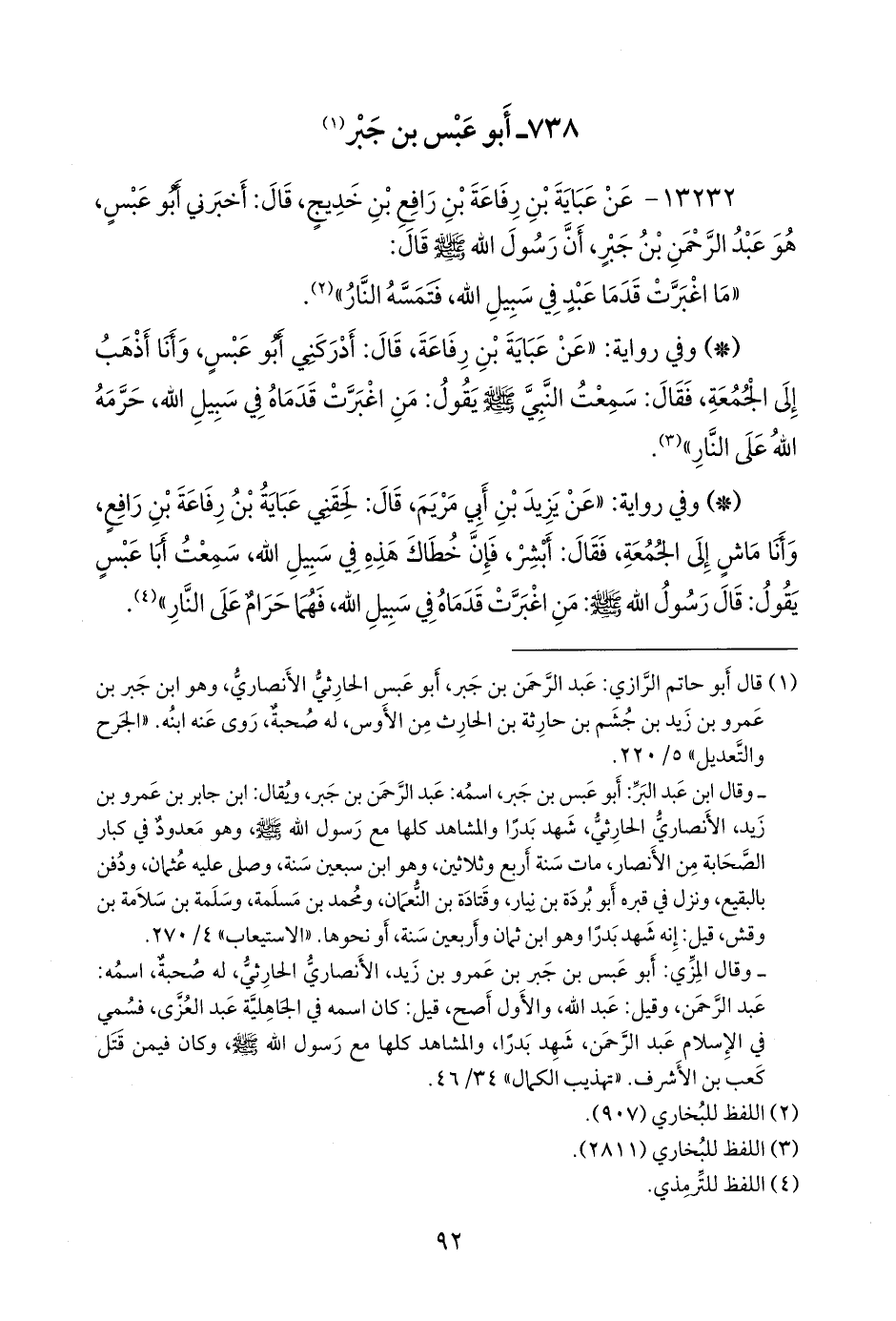 - وفي رواية: «عن يزيد بن أبي مريم، قال: لحقني عباية بن رفاعة بن رافع، وأنا ماش إلى الجمعة، فقال: أبشر، فإن خطاك هذه في سبيل الله، سمعت أبا عبس يقول: قال رسول الله صَلى الله عَليه وسَلم: من اغبرت قدماه في سبيل الله، فهما حرام على النار» (¬٤).