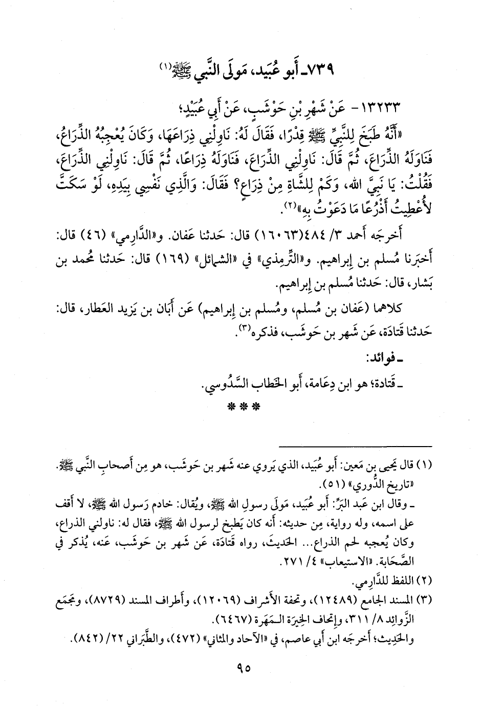 - وقال ابن عبد البَر: أَبو عبيد مولى رسول الله صَلى الله عَليه وسَلم ويقال: خادم رسول الله صَلى الله عَليه وسَلم لا أقف على اسمه، وله رواية، من حديثه: أنه كان يطبخ لرسول الله صَلى الله عَليه وسَلم فقال له: ناولني الذراع، وكان يعجبه لحم الذراع، الحديث، رواه قتادة، عن شهر بن حوشب، عنه، يذكر في الصحابة. «الاستيعاب» ٤/ ٢٧١.