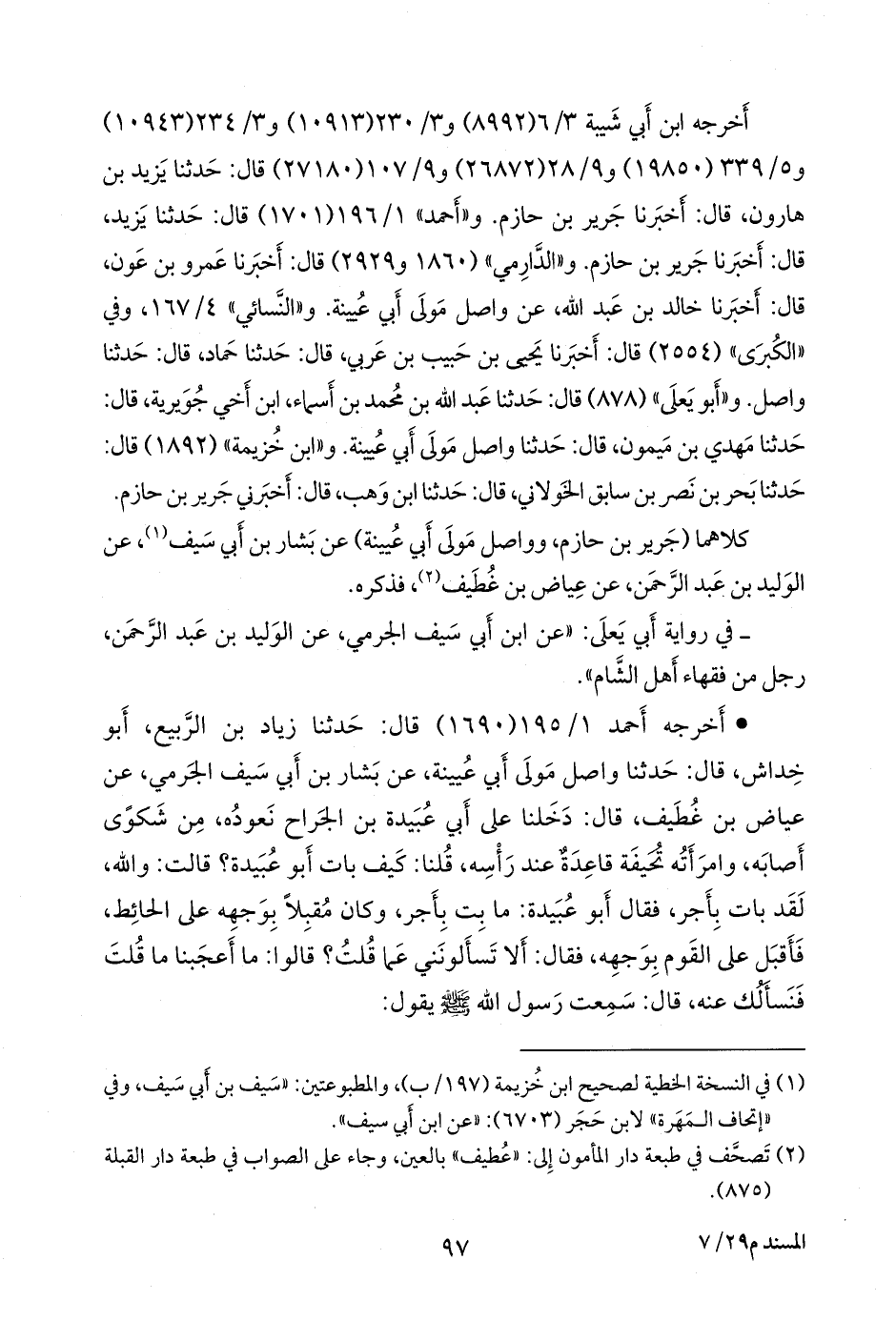 و «أحمد» (١٧٠١) قال: حدثنا يزيد، قال: أخبرنا جَرير بن حازم. و «الدَّارِمي» (١٨٦٠ و ٢٩٢٩) قال: أخبرنا عَمرو بن عون، قال: أخبرنا خالد بن عبد الله، عن واصل مولى أبي عُيينة. و «النَّسَائي» ٤/ ١٦٧، وفي «الكبرى» (٢٥٥٤) قال: أخبرنا يحيى بن حبيب بن عربي، قال: حدثنا حماد، قال: حدثنا واصل. و «أَبو يَعلى» (٨٧٨) قال: حدثنا عبد الله بن محمد بن أسماء، ابن أخي جويرية، قال: حدثنا مهدي بن ميمون، قال: حدثنا واصل مولى أبي عُيينة. و «ابن خزيمة» (١٨٩٢) قال: حدثنا بحر بن نصر بن سابق الخَولاني، قال: حدثنا ابن وهب، قال: أخبرني جَرير بن حازم.