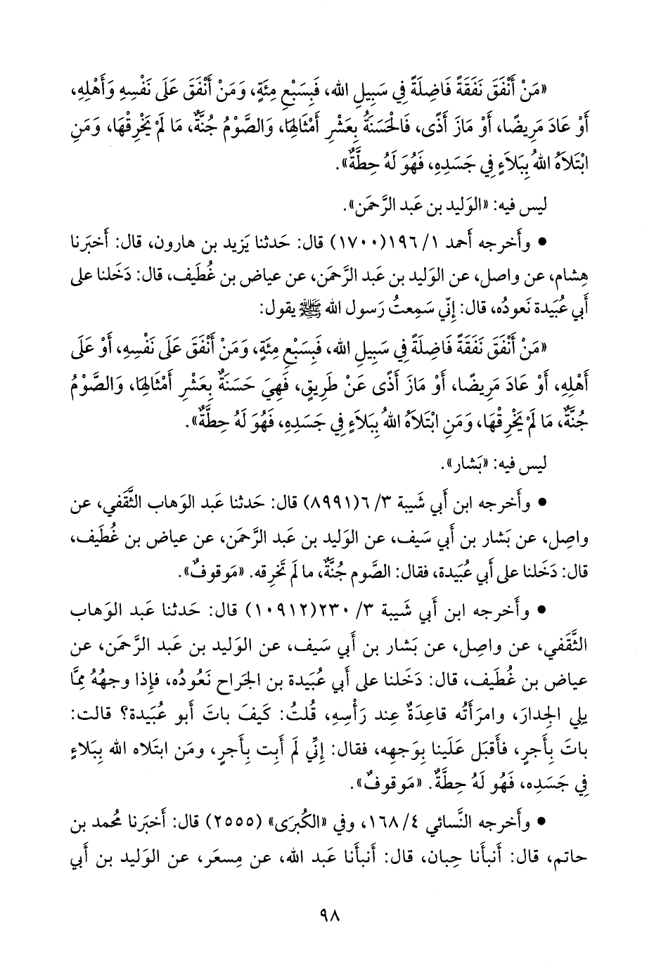 «من أنفق نفقة فاضلة في سبيل الله، فبسبع مئة، ومن أنفق على نفسه، أو على أهله، أو عاد مريضا، أو ماز أذى عن طريق، فهي حسنة بعشر أمثالها، والصوم جنة، ما لم يخرقها، ومن ابتلاه الله ببلاء في جسده، فهو له حطة».