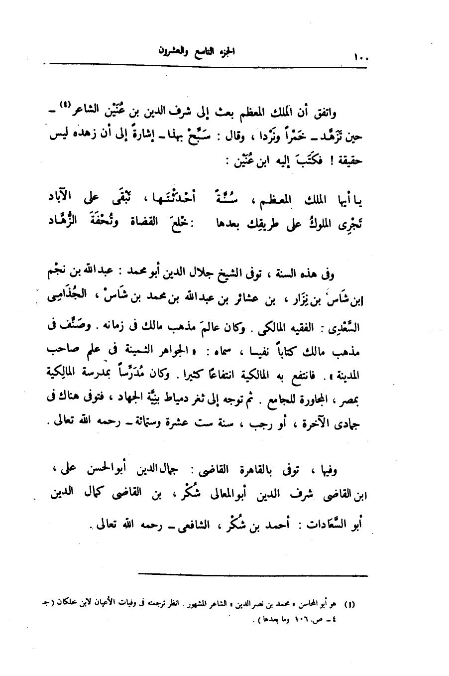 وفى هذه السنة، توفى الشيخ جلال الدين أبو محمد: عبد الله بن نجم ابن شاس بن نزار، بن عشائر بن عبد الله بن محمد بن شاس، الجذامى السّعدى: الفقيه المالكى. وكان عالم مذهب مالك فى زمانه. وصنّف فى مذهب مالك كتابا نفيسا، سماه: «الجواهر الثمينة فى علم صاحب المدينة» . فانتفع به المالكية انتفاعا كثيرا. وكان مدرّسا بمدرسة المالكية بمصر، المجاورة للجامع. ثم توجه إلى ثغر دمياط بنيّة الجهاد، فتوفى هناك فى جمادى الآخرة، أو رجب، سنة ست عشرة وستمائة- رحمه الله تعالى.