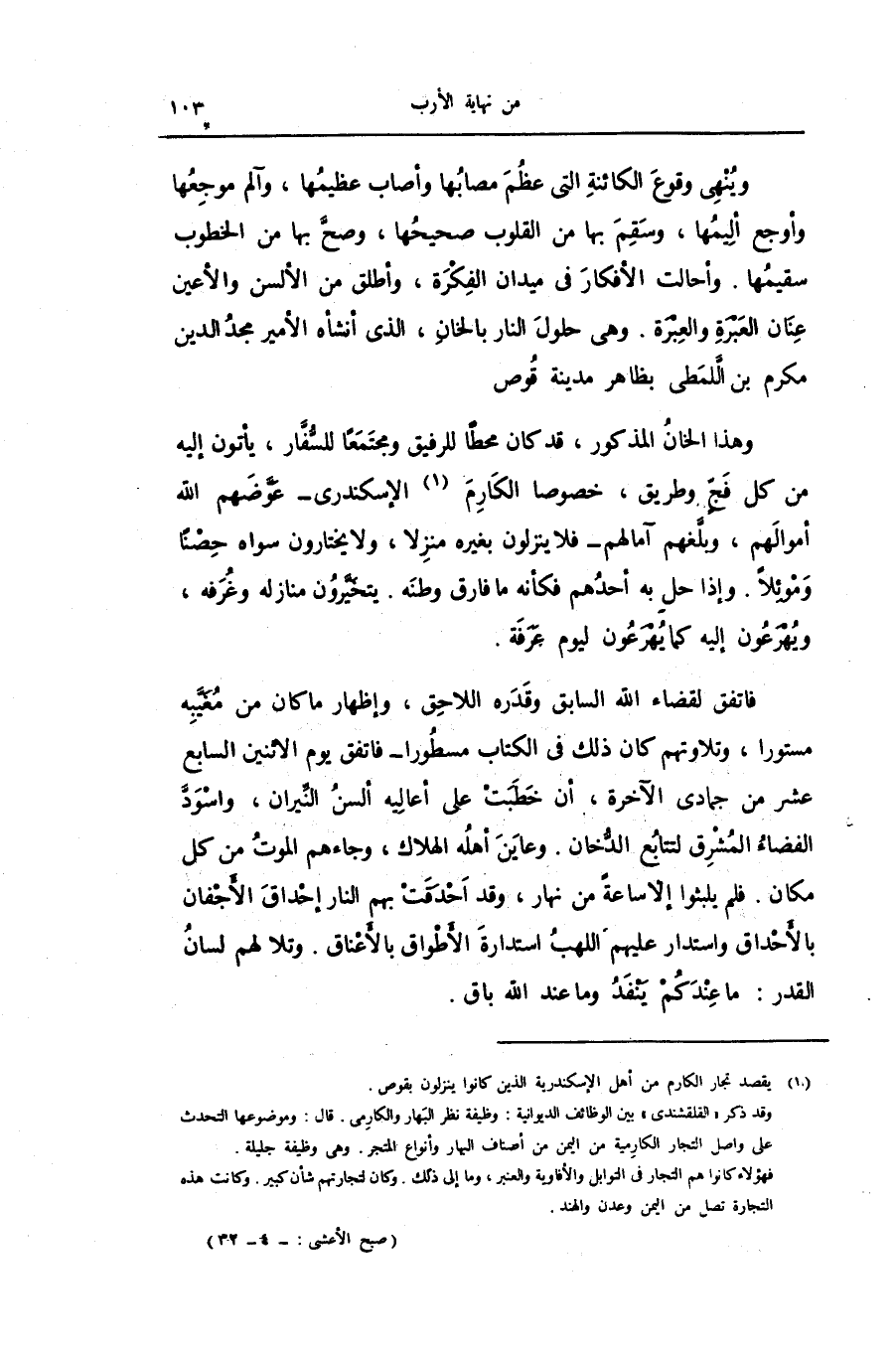 وينهى وقوع الكائنة التى عظم مصابها وأصاب عظيمها، وآلم موجعها وأوجع أليمها، وسقم بها من القلوب صحيحها، وصحّ بها من الخطوب سقيمها. وأحالت الأفكار فى ميدان الفكرة، وأطلق من الألسن والأعين عنان العبرة والعبرة. وهى حلول النار بالخان، الذى أنشأه الأمير مجد الدين مكرم بن الّلمطى بظاهر مدينة قوص وهذا الخان المذكور، قد كان محطا للرفيق ومجتمعا للسّفّار، يأتون إليه من كل فجّ وطريق، خصوصا الكارم «1» الإسكندرى- عوّضهم الله أموالهم، وبلّغهم آمالهم- فلا ينزلون بغيره منزلا، ولا يختارون سواه حصنا وموئلا. وإذا حل به أحدهم فكأنه ما فارق وطنه. يتخيّرون منازله وغرفه، ويهرعون إليه كما يهرعون ليوم عرفة.