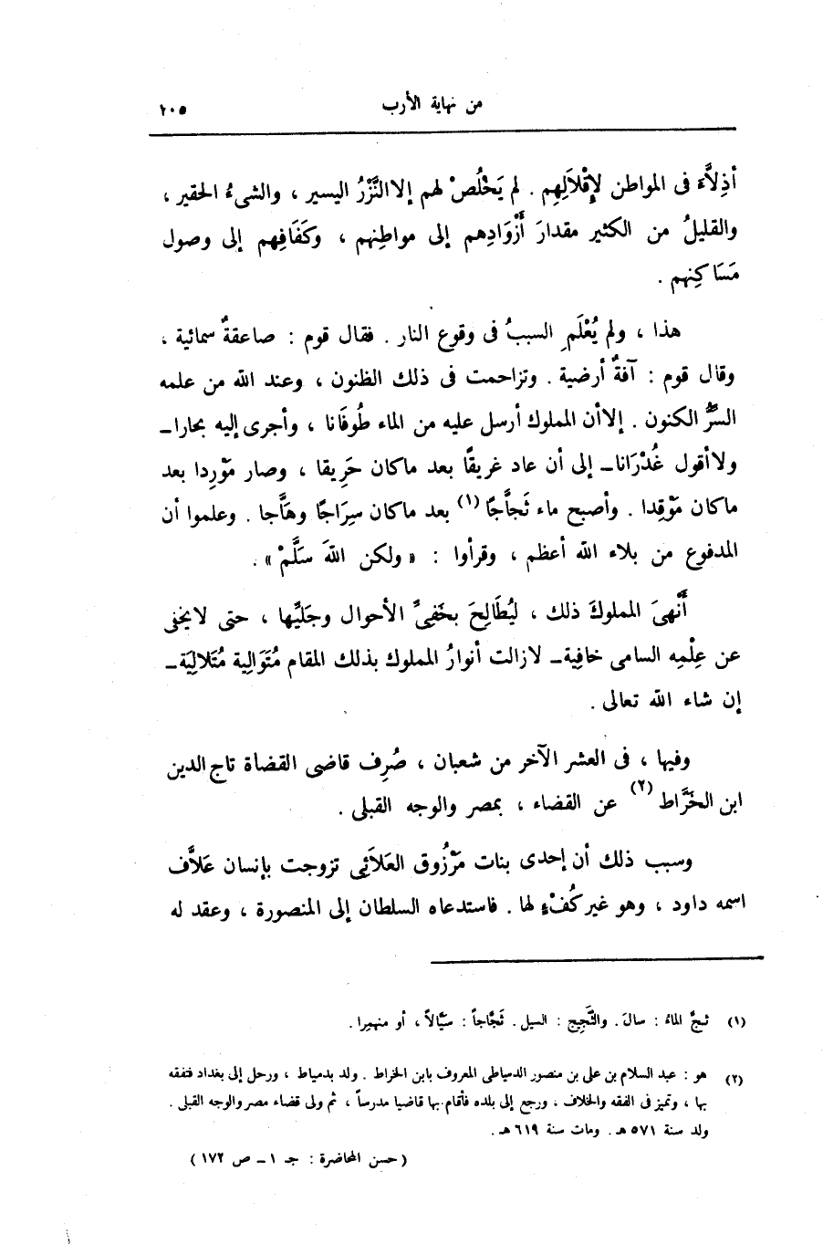 هذا، ولم يعلم السبب فى وقوع النار. فقال قوم: صاعقة سمائية، وقال قوم: آفة أرضية. وتزاحمت فى ذلك الظنون، وعند الله من علمه السّرّ الكنون. إلا أن المملوك أرسل عليه من الماء طوفانا، وأجرى اليه بحارا- ولا أقول غدرانا- إلى أن عاد غريقا بعد ما كان حريقا، وصار موردا بعد ما كان موقدا. وأصبح ماء ثجّاجا «1» بعد ما كان سراجا وهاّجا. وعلموا أن المدفوع من بلاء الله أعظم، وقرأوا: «ولكن الله سلّم» .