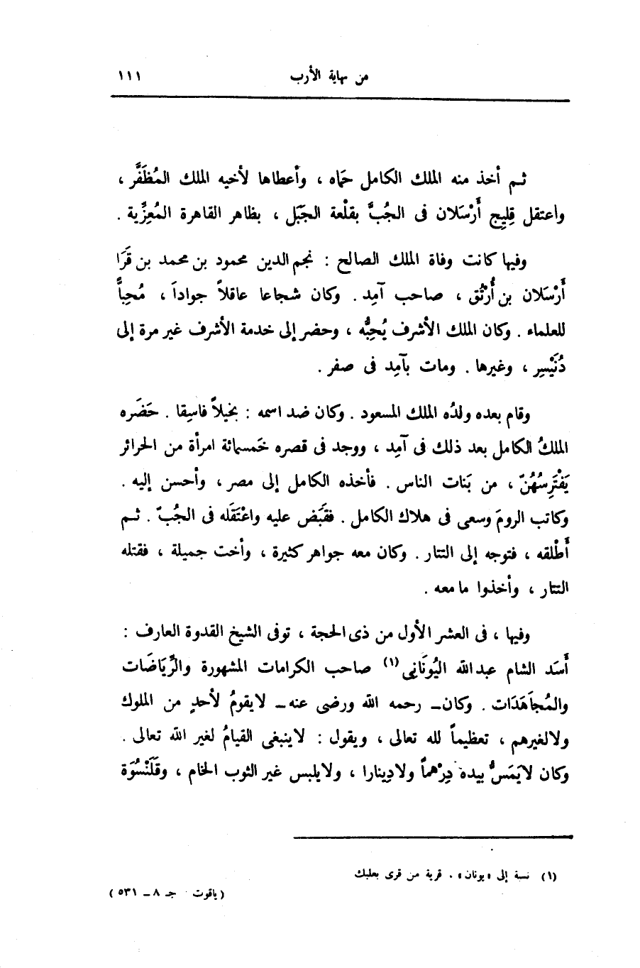 وكاتب الروم وسعى فى هلاك الكامل. فقبض عليه واعتقله فى الجبّ. ثم أطلقه، فتوجه إلى التتار. وكان معه جواهر كثيرة، وأخت جميلة، فقتله التتار، وأخذوا ما معه.