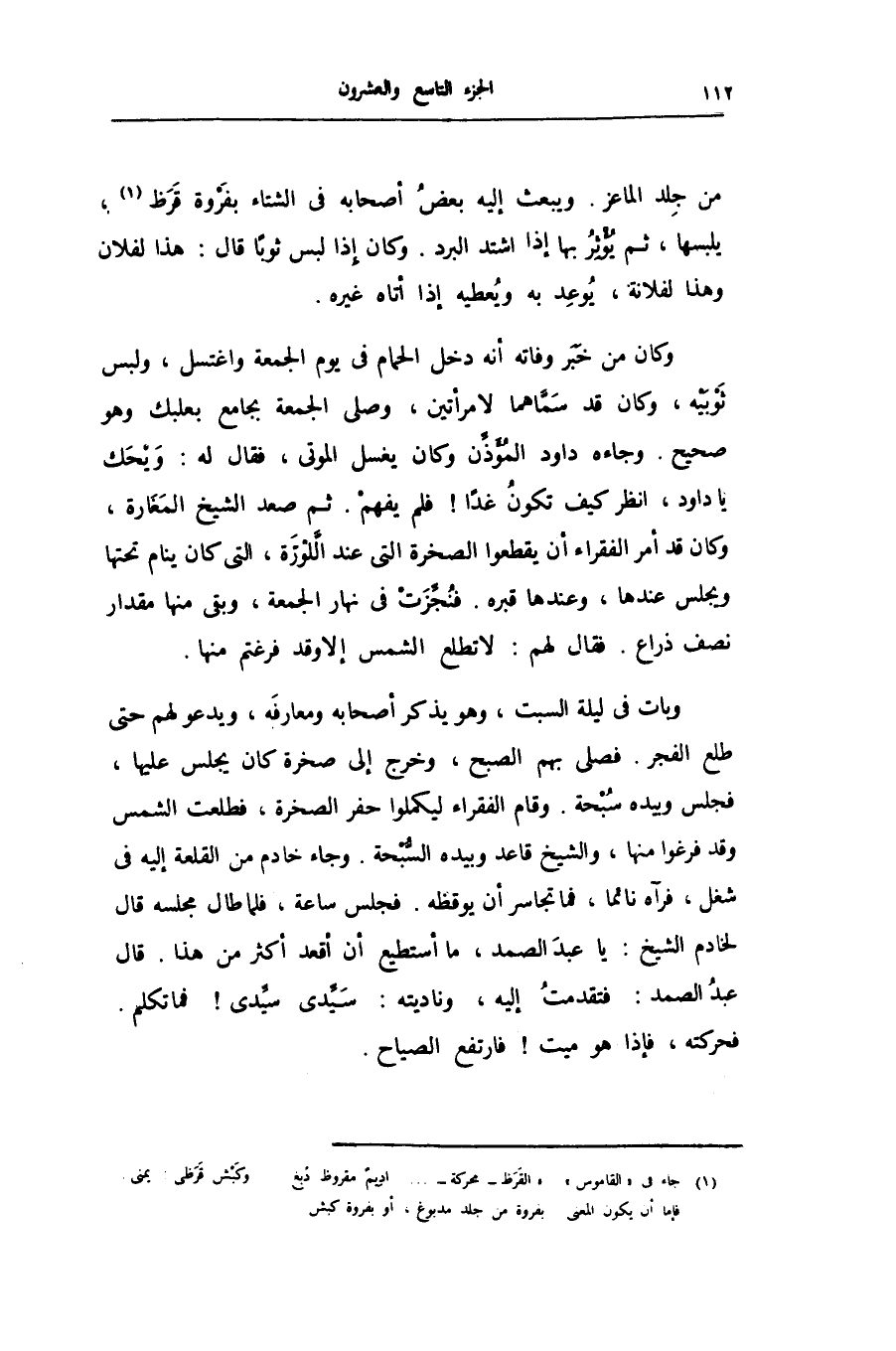 وبات فى ليلة السبت، وهو يذكر أصحابه ومعارفه، ويدعو لهم حتى طلع الفجر. فصلى بهم الصبح، وخرج إلى صخرة كان يجلس عليها، فجلس وبيده سبحة. وقام الفقراء ليكملوا حفر الصخرة، فطلعت الشمس وقد فرغوا منها، والشيخ قاعد وبيده السّبحة. وجاء خادم من القلعة إليه فى شغل، فرآه نائما، فما تجاسر أن يوقظه. فجلس ساعة، فلما طال مجلسه قال لخادم الشيخ: يا عبد الصمد، ما أستطيع أن أقعد أكثر من هذا. قال عبد الصمد: فتقدمت إليه، وناديته: سيّدى سيّدى! فما تكلم.