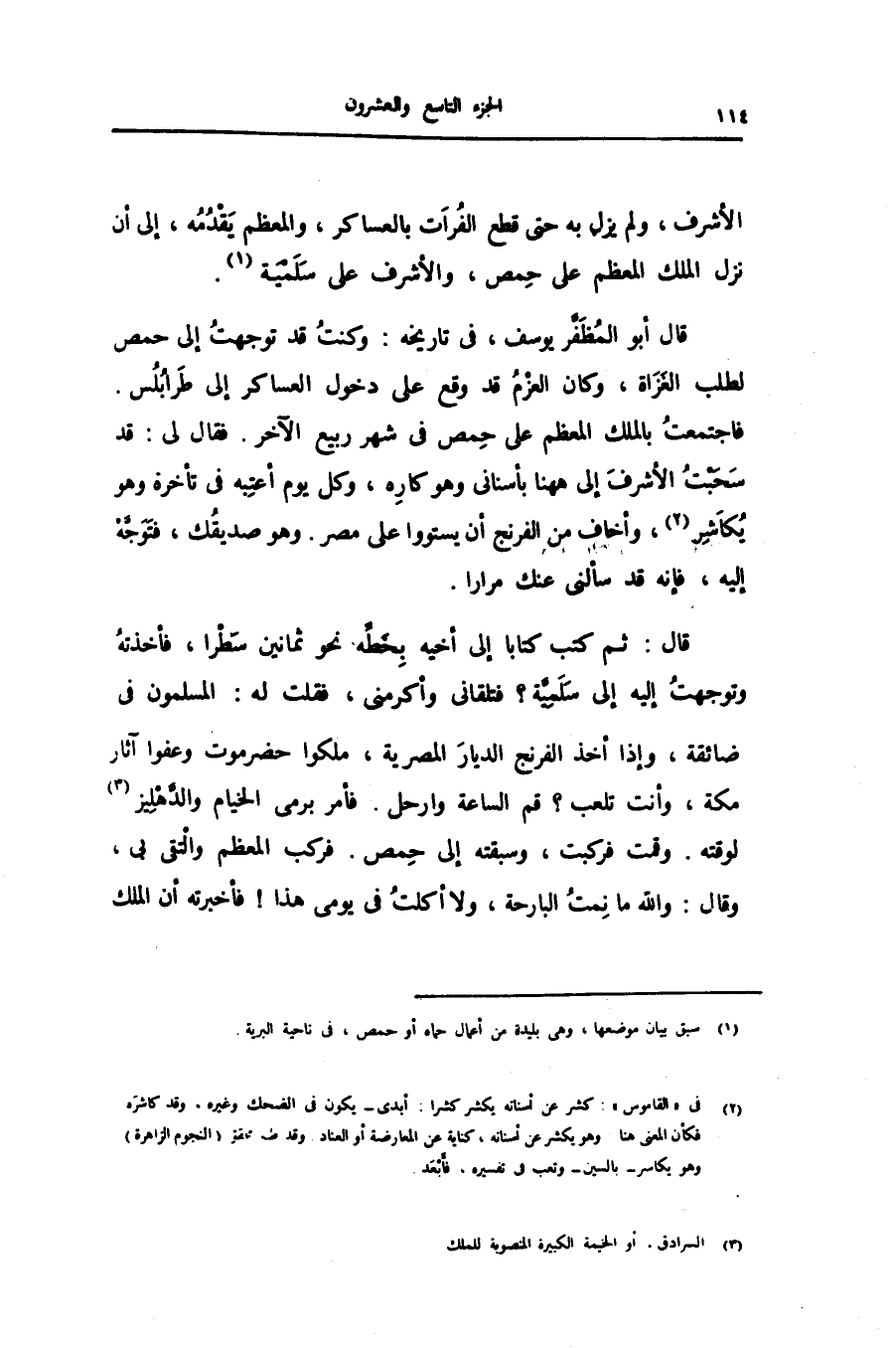 قال: ثم كتب كتابا إلى أخيه بخطّه نحو ثمانين سطرا، فأخذته وتوجهت إليه إلى سلميّة؟ فتلقانى وأكرمنى، فقلت له: المسلمون فى ضائقة، واذا أخذ الفرنج الديار المصرية، ملكوا حضرموت وعفوا آثار مكة، وأنت تلعب؟ قم الساعة وارحل. فأمر برمى الخيام والدّهليز «3» لوقته. وقمت فركبت، وسبقته إلى حمص. فركب المعظم والتقى بى، وقال: والله ما نمت البارحة، ولا أكلت فى يومى هذا! فأخبرته أن الملك