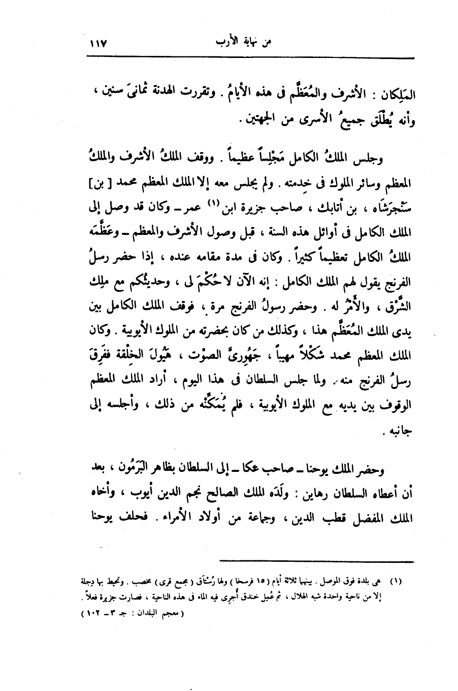 وجلس الملك الكامل مجلسا عظيما. ووقف الملك الأشرف والملك المعظم وسائر الملوك فى خدمته. ولم يجلس معه إلا الملك المعظم محمد [بن] سنجرشاه، بن أتابك، صاحب جزيرة ابن «1» عمر- وكان قد وصل إلى الملك الكامل فى أوائل هذه السنة، قبل وصول الأشرف والمعظم- وعظّمه الملك الكامل تعظيما كثيرا. وكان فى مدة مقامه عنده، إذا حضر رسل الفرنج يقول لهم الملك الكامل: إنه الآن لا حكم لى، وحديثكم مع ملك الشّرق، والأمر له. وحضر رسول الفرنج مرة، فوقف الملك الكامل بين يدى الملك المعظّم هذا، وكذلك من كان بحضرته من الملوك الأيوبية. وكان الملك المعظم محمد شكلا مهيبا، جهورىّ الصوت، هيول الخلقة ففرق رسل الفرنج منه. ولما جلس السلطان فى هذا اليوم، أراد الملك المعظم الوقوف بين يديه مع الملوك الأيوبية، فلم يمكّنه من ذلك، وأجلسه إلى جانبه.
