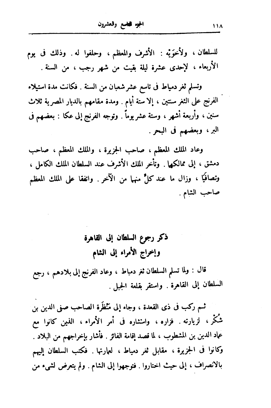قال: ولما تسلم السلطان ثغر دمياط، وعاد الفرنج إلى بلادهم، رجع السلطان إلى القاهرة. واستقر بقلعة الجبل.