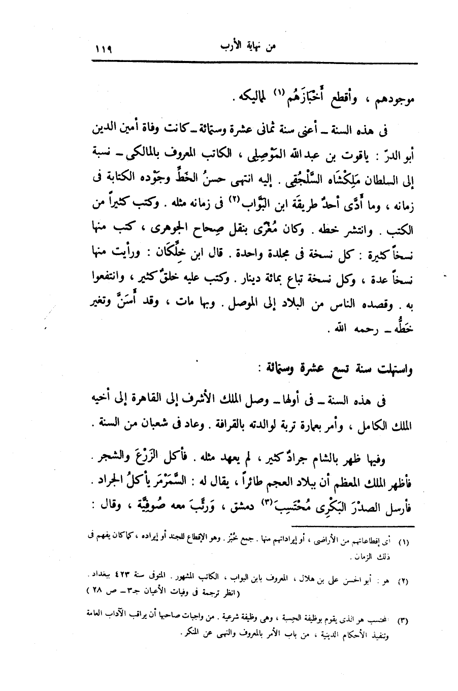 فى هذه السنة- أعنى سنة ثمانى عشرة وستمائة- كانت وفاة أمين الدين أبو الدرّ: ياقوت بن عبد الله الموصلى، الكاتب المعروف بالمالكى- نسبة إلى السلطان ملكشاه السّلجقى. إليه انتهى حسن الخطّ وجوده الكتابة فى زمانه، وما أدّى أحد طريقة ابن البوّاب «2» فى زمانه مثله. وكتب كثيرا من الكتب. وانتشر خطه. وكان مغرى بنقل صحاح الجوهرى، كتب منها نسخا كثيرة: كل نسخة فى مجلدة واحدة. قال ابن خلّكان: ورأيت منها نسخا عدة، وكل نسخة تباع بمائة دينار. وكتب عليه خلق كثير، وانتفعوا به. وقصده الناس من البلاد إلى الموصل. وبها مات، وقد أسنّ وتغير خطّه- رحمه الله.