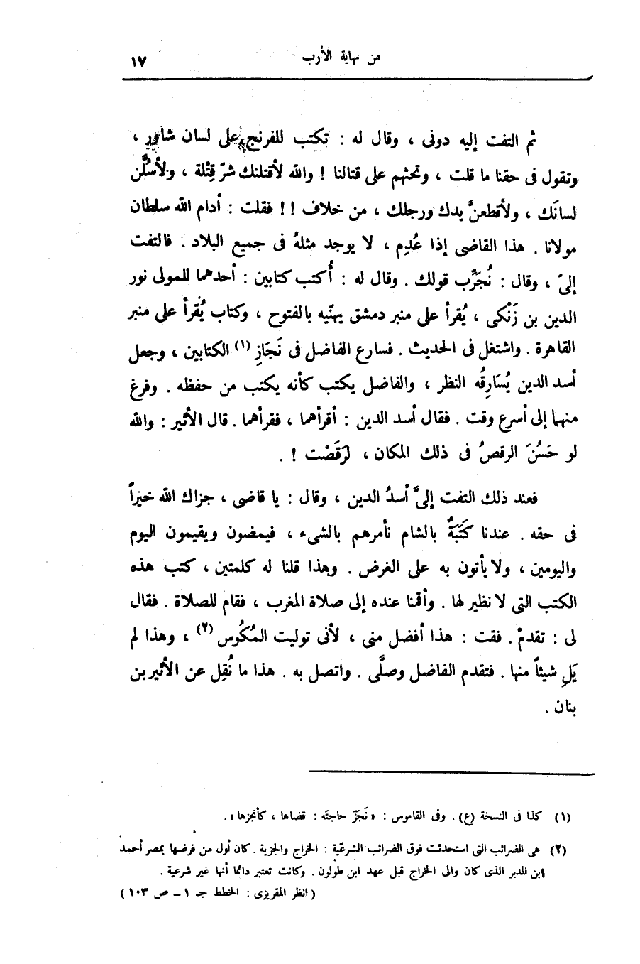 فعند ذلك التفت إلىّ أسد الدين، وقال: يا قاضى، جزاك الله خيرا فى حقه. عندنا كتبة بالشام نأمرهم بالشىء، فيمضون ويقيمون اليوم واليومين، ولا يأتون به على الغرض. وهذا قلنا له كلمتين، كتب هذه الكتب التى لا نظير لها. وأقمنا عنده إلى صلاة المغرب، فقام للصلاة. فقال لى: تقدم. فقت: هذا أفضل منى، لأنى توليت المكوس «2» ، وهذا لم يل شيئا منها. فتقدم الفاضل وصلّى. واتصل به. هذا ما نقل عن الأثير بن بنان.