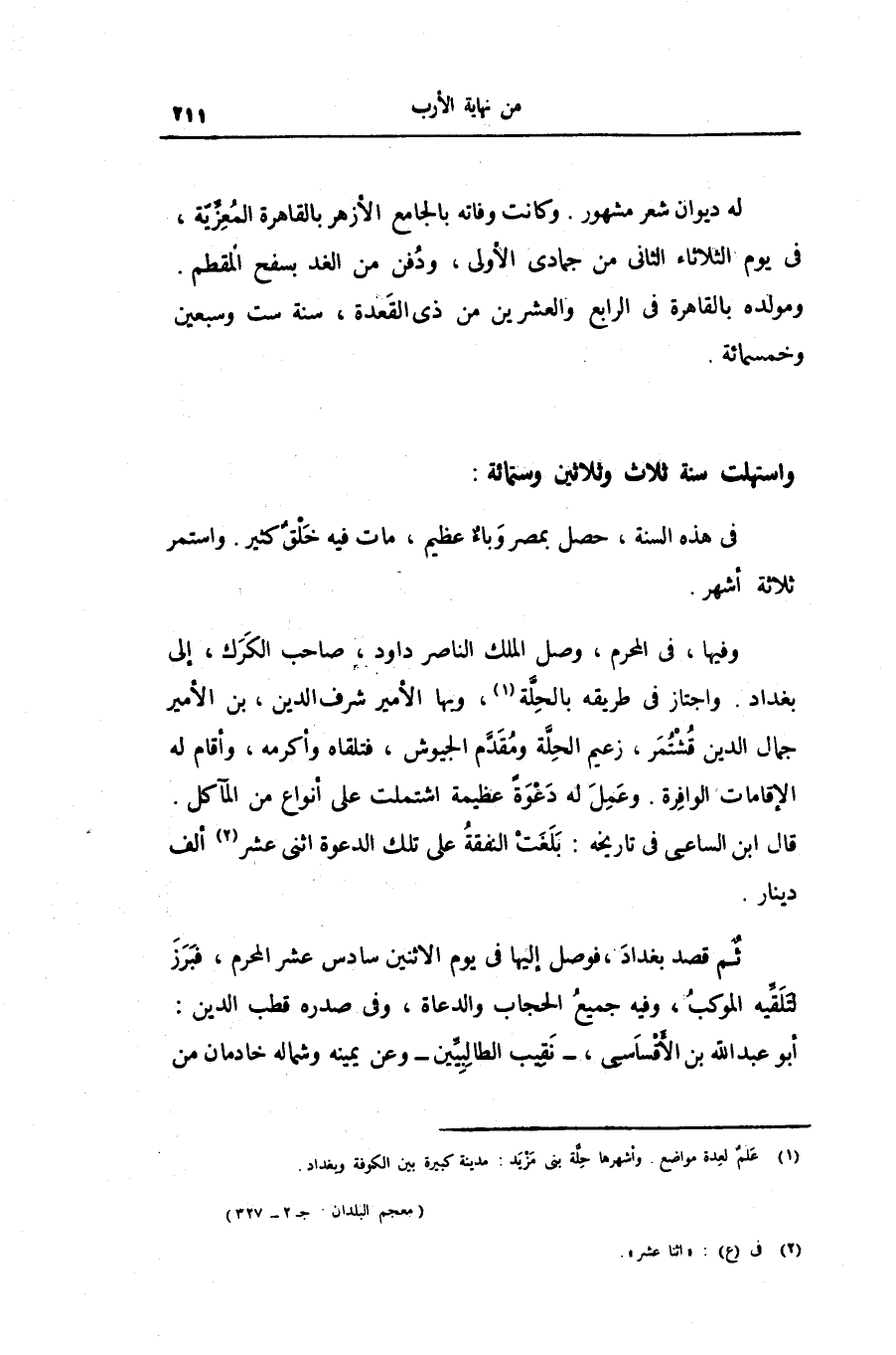 وفيها، فى المحرم، وصل الملك الناصر داود، صاحب الكرك، إلى بغداد. واجتاز فى طريقه بالحلّة «1» ، وبها الأمير شرف الدين، بن الأمير جمال الدين قشتمر، زعيم الحلّة ومقدّم الجيوش، فتلقاه وأكرمه، وأقام له الإقامات الوافرة. وعمل له دعوة عظيمة اشتملت على أنواع من المآكل.