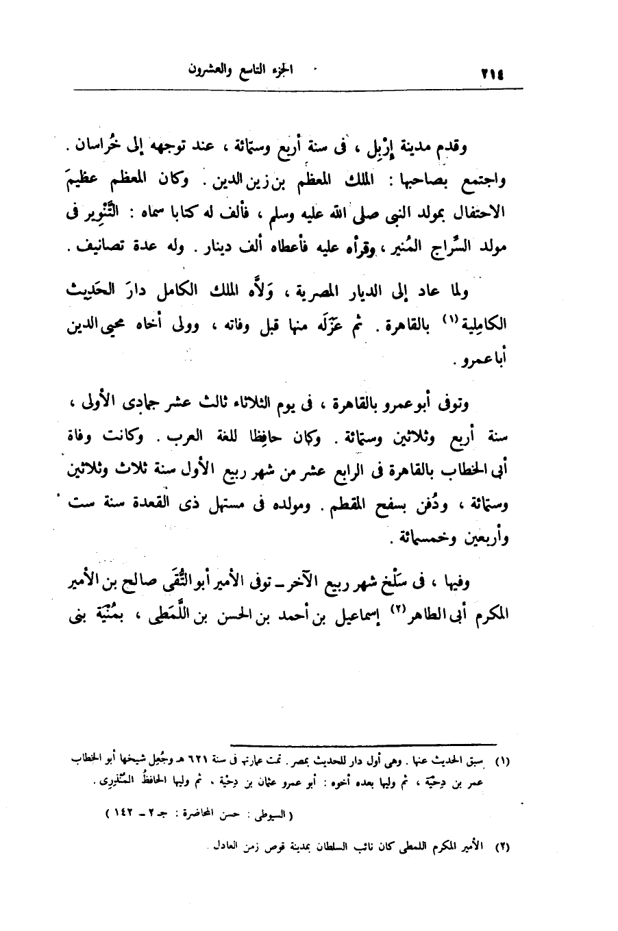 واجتمع بصاحبها: الملك المعظم بن زين الدين. وكان المعظم عظيم الاحتفال بمولد النبى صلى الله عليه وسلم، فألف له كتابا سماه: التّنوير فى مولد السّراج المنير، وقرأه عليه فأعطاه ألف دينار. وله عدة تصانيف.