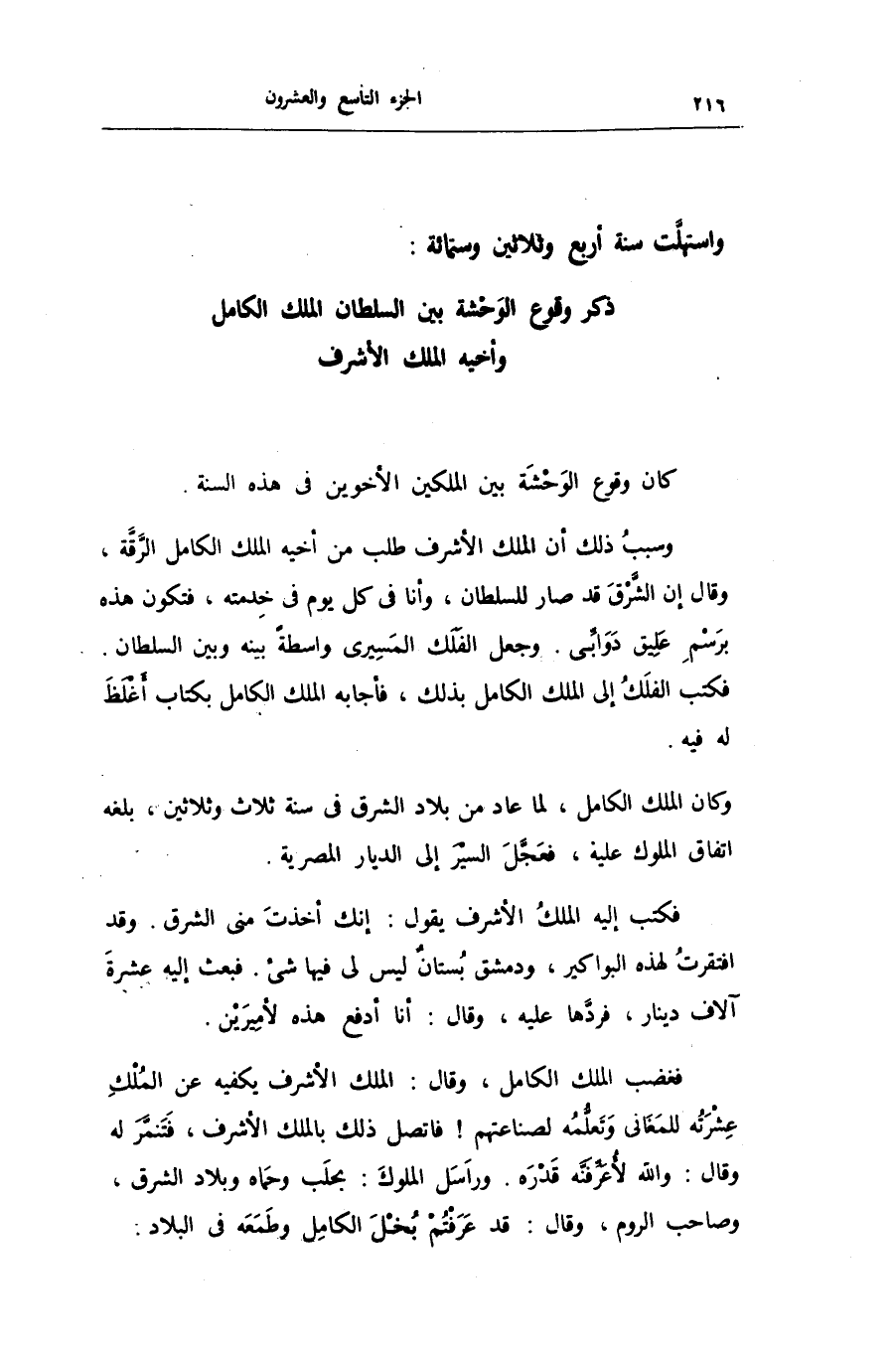 وسبب ذلك أن الملك الأشرف طلب من أخيه الملك الكامل الرّقّة، وقال إن الشّرق قد صار للسلطان، وأنا فى كل يوم فى خدمته، فتكون هذه برسم عليق دوابّى. وجعل الفلك المسيرى واسطة بينه وبين السلطان.