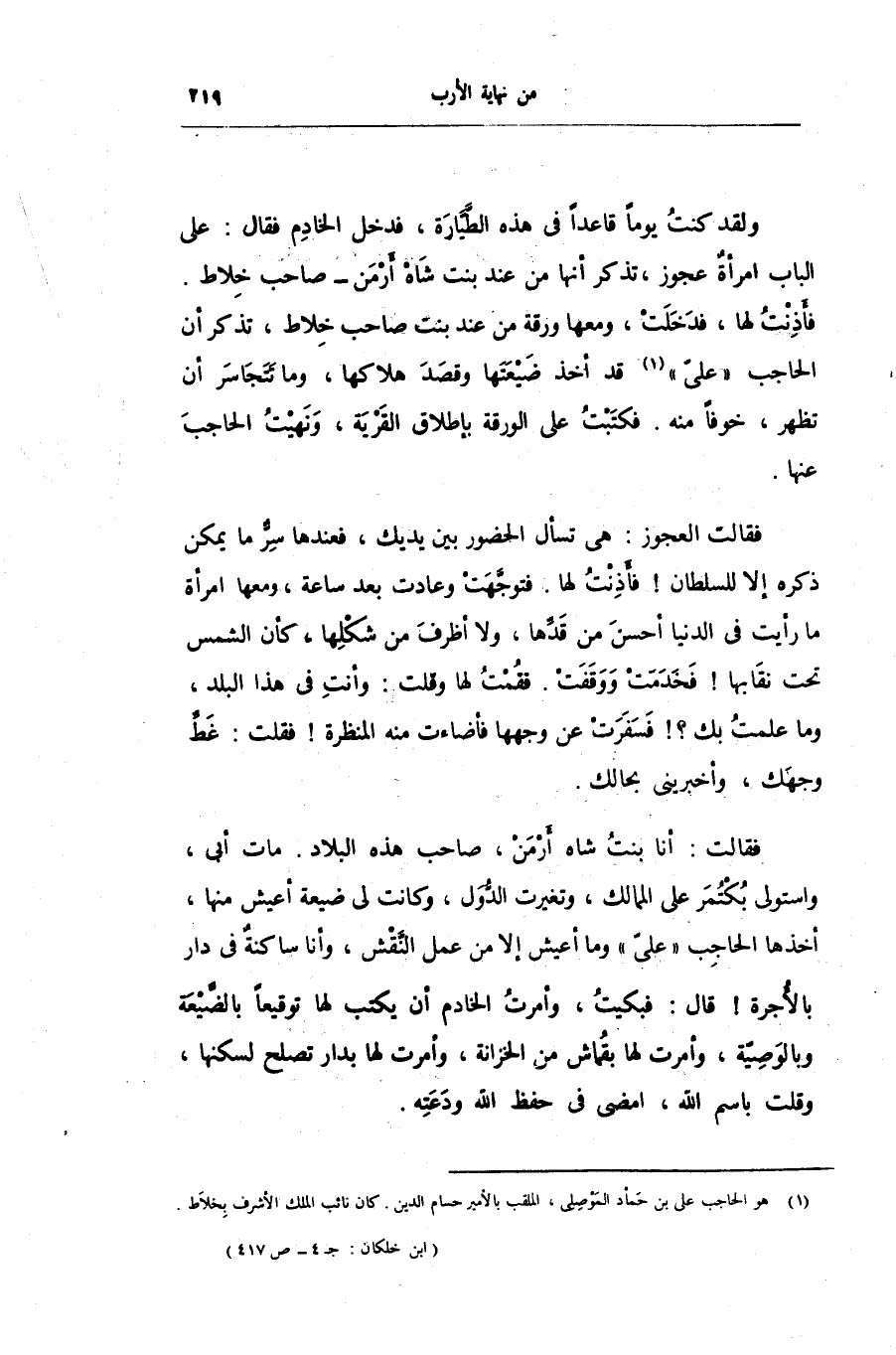 ولقد كنت يوما قاعدا فى هذه الطّيّارة، فدخل الخادم فقال: على الباب امرأة عجوز، تذكر أنها من عند بنت شاه أرمن- صاحب خلاط.