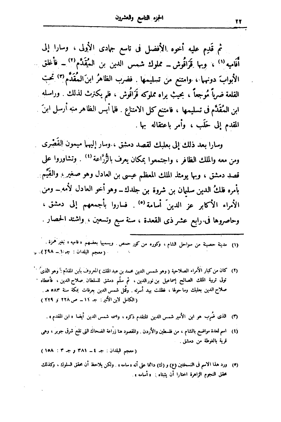 وسارا بعد ذلك إلى بعلبك لقصد دمشق، وسار إليهما ميمون القصرى ومن معه والملك الظافر، واجتمعوا بمكان يعرف بالزّرّاعة «4» . وتشاوروا على قصد دمشق، وبها يومئذ الملك المعظم عيسى بن العادل وهو صغير، والقيّم بأمره فلك الدين سليمان بن شروة بن جلدك- وهو أخو العادل لأمه- ومن الأمراء الأكابر عز الدّين أسامة «5» . فساروا بأجمعهم إلى دمشق، وحاصروها فى رابع عشر ذى القعدة، سنة سبع وتسعين، واشتد الحصار.