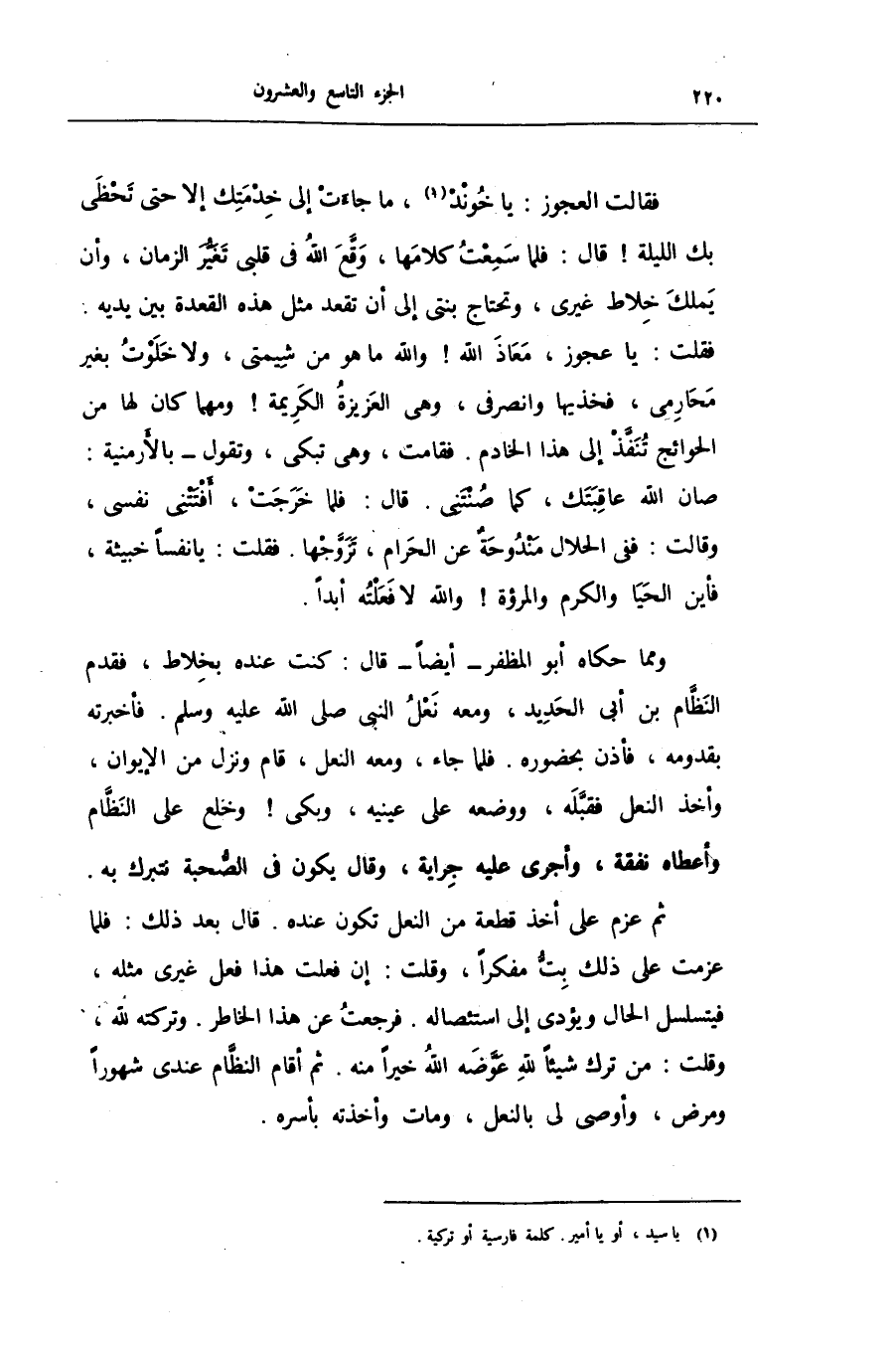 فقلت: يا عجوز، معاذ الله! والله ما هو من شيمتى، ولا خلوت بغير محارمى، فخذيها وانصرفى، وهى العزيزة الكريمة! ومهما كان لها من الحوائج تنفّذ إلى هذا الخادم. فقامت، وهى تبكى، وتقول- بالأرمنية: