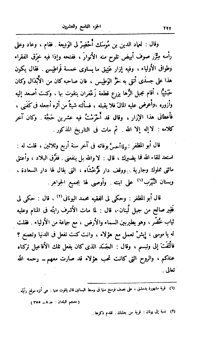 وقال: لعماد الدين بن موسك أحضر لى الوديعة. فقام، وعاد وعلى رأسه مئزر صوف أبيض تلوح منه الأنوار، ففتحه وإذا فيه خرق الفقراء وطواقى الأولياء، وفيه إزار عتيق ما يساوى خمسة قراطيس. فقال يكون هذا على جسدى أتقى به حرّ الوطيس، فان صاحبه كان من الأبدال وكان حبشيّا، أقام بحبل الرّها يزرع قطعة زعفران يتقوت بها، وكنت أصعد إليه وأزوره، وأعرض عليه المال فلا يقبله، فسألته شيئا من أثره أجعله فى كفنى، فأعطانى هذا الإزار، وقال قد أحرمت فيه عشرين حجّة. وكان آخر كلامه: لا إله إلا الله. ثم مات فى التاريخ المذكور.