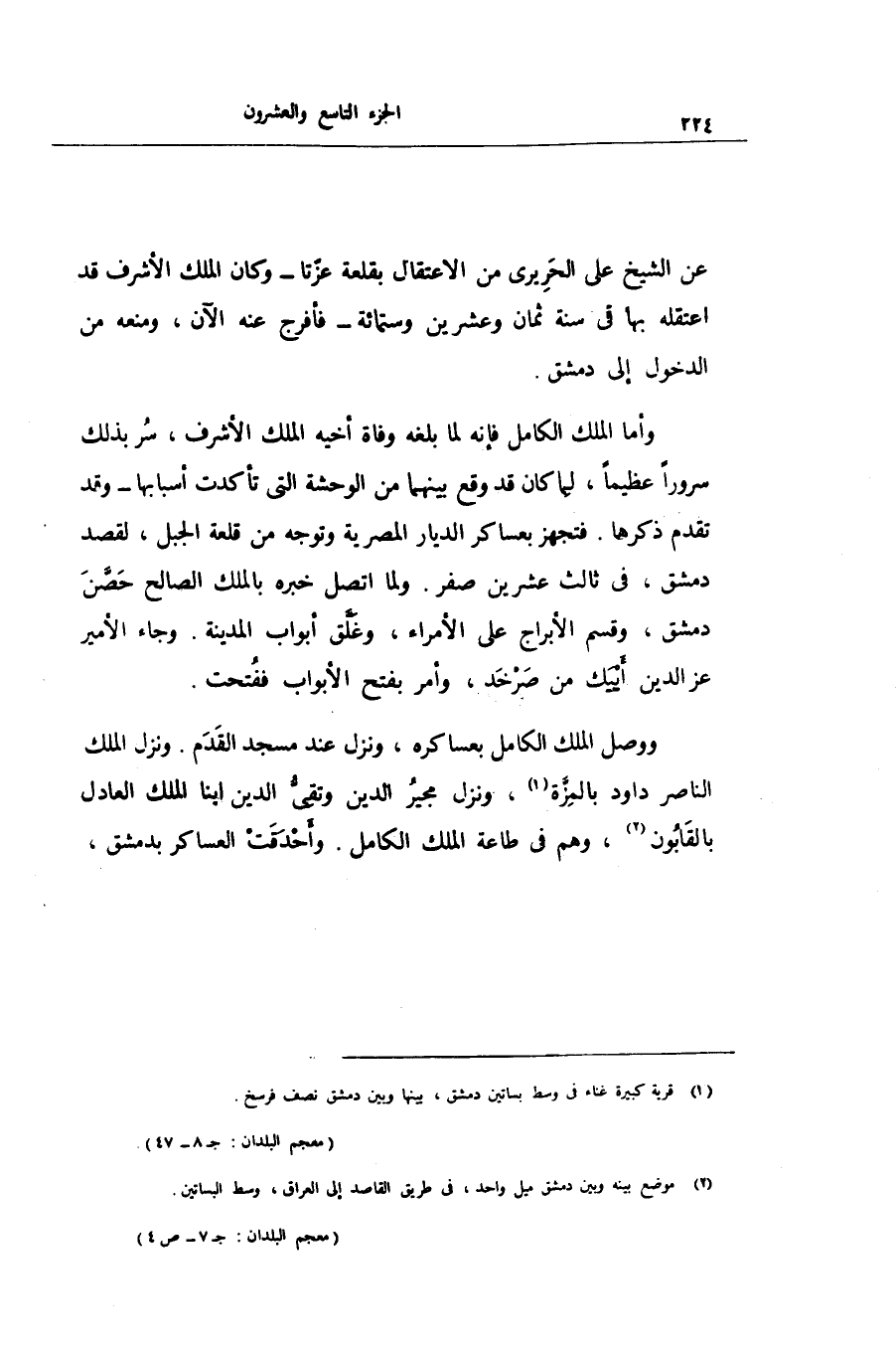ووصل الملك الكامل بعساكره، ونزل عند مسجد القدم. ونزل الملك الناصر داود بالمزّة «1» ، ونزل مجير الدين وتقىّ الدين ابنا الملك العادل بالقابون «2» ، وهم فى طاعة الملك الكامل. وأحدقت العساكر بدمشق،