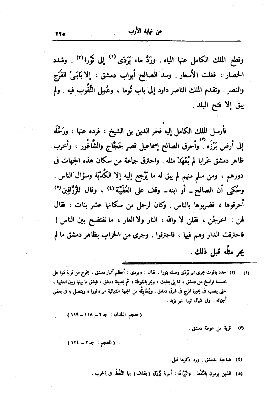 فأرسل الملك الكامل إليه فخر الدين بن الشيخ، فرده عنها، ورحّله إلى أرض برزه. «3» وأحرق الصالح إسماعيل قصر حجّاج والشّاغور، وأخرب ظاهر دمشق خرابا لم يعهد مثله. واحترق جماعة من سكان هذه الجهات فى دورهم، ومن سلم منهم لم يبق له ما يرجع إليه إلا الكدية وسؤال الناس.
